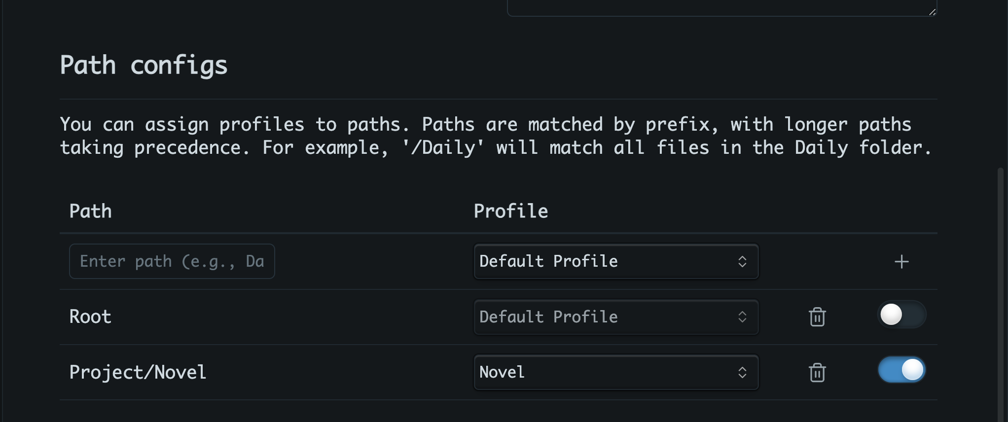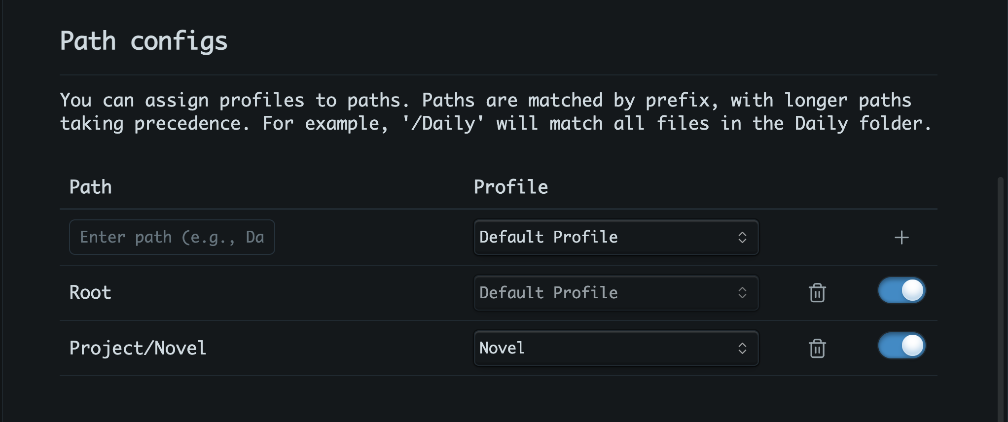 You can create multiple profiles and assign them to specific note paths. For example, you might want a more formal profile for research notes and a more creative one for writing fiction. Corresponding profile will be automatically activated when you open a note matching the assigned path.