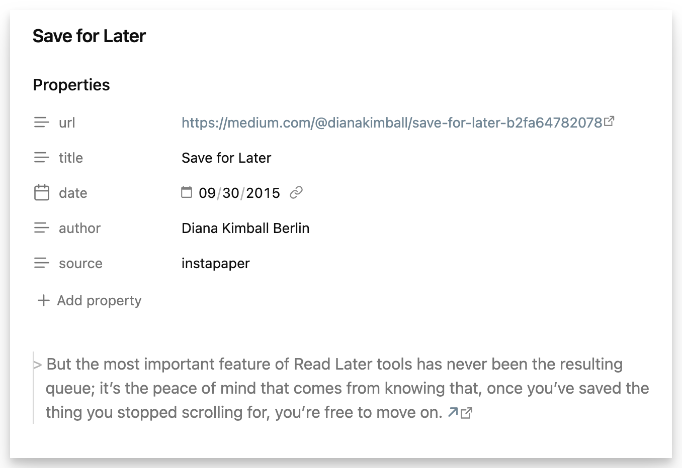 Properties are only added to notes when they have values available from Instapaper.