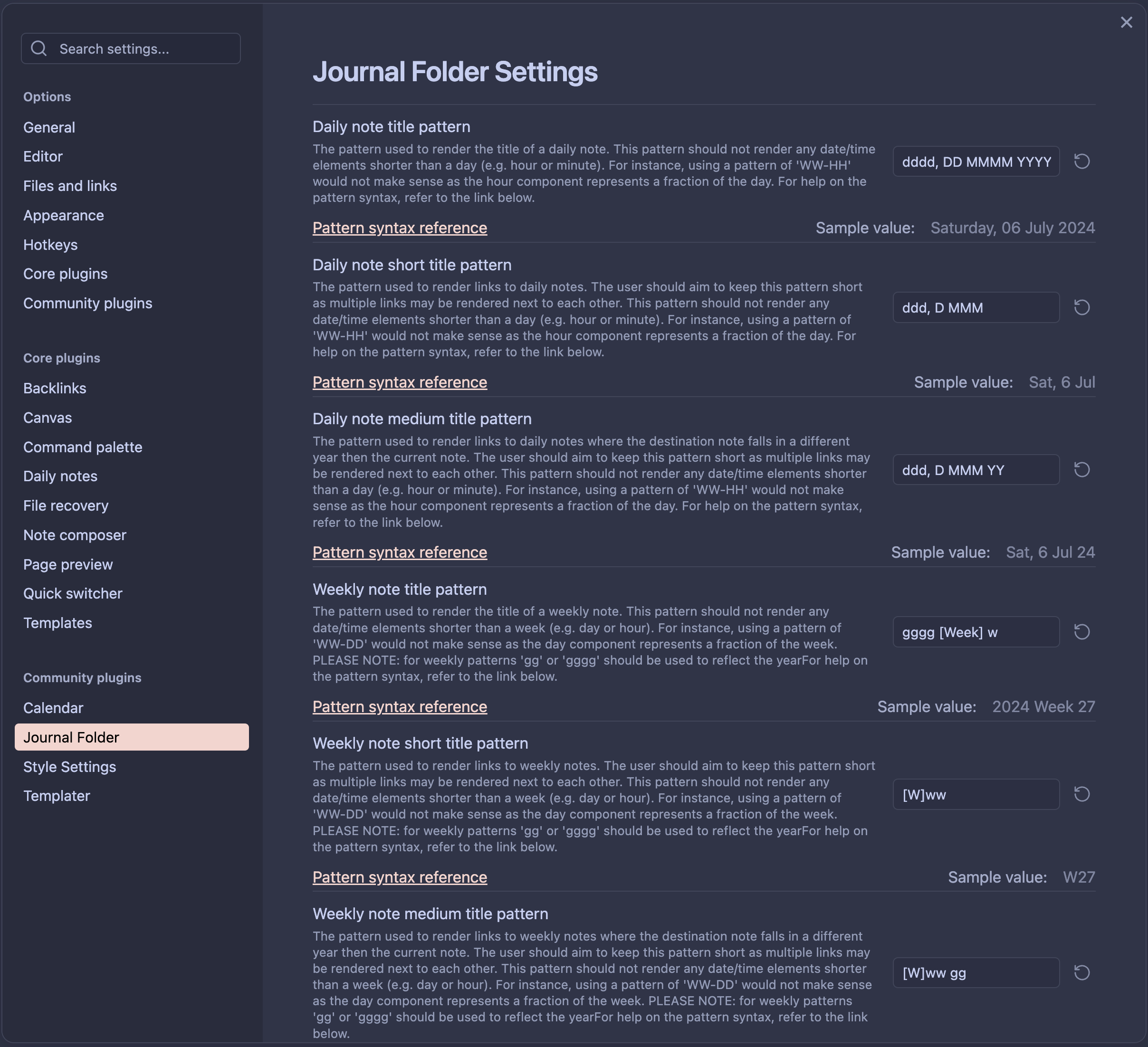 [!CAUTION] As previously noted, the filename format for journal files isn't configurable in the first releases of this plugin. The filename format used for weekly note files is