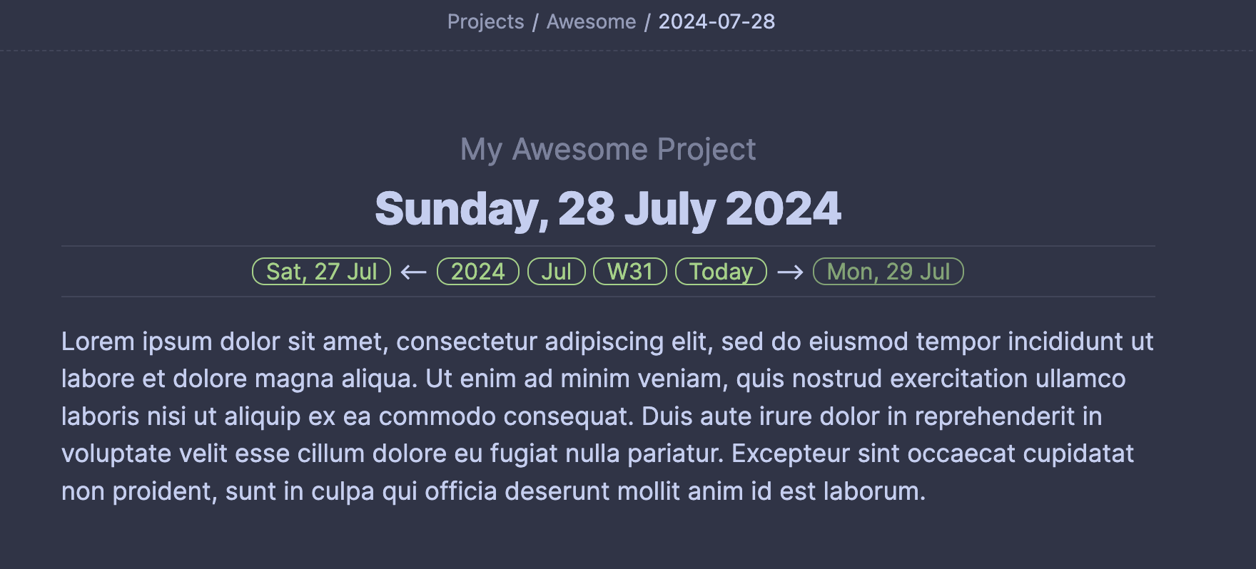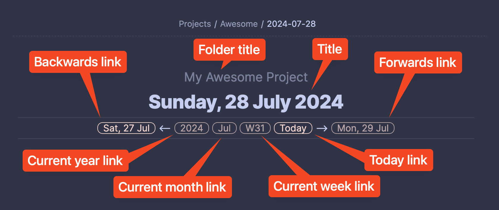 - Renders the date represented by the journal note, using the specified date format for the note type.