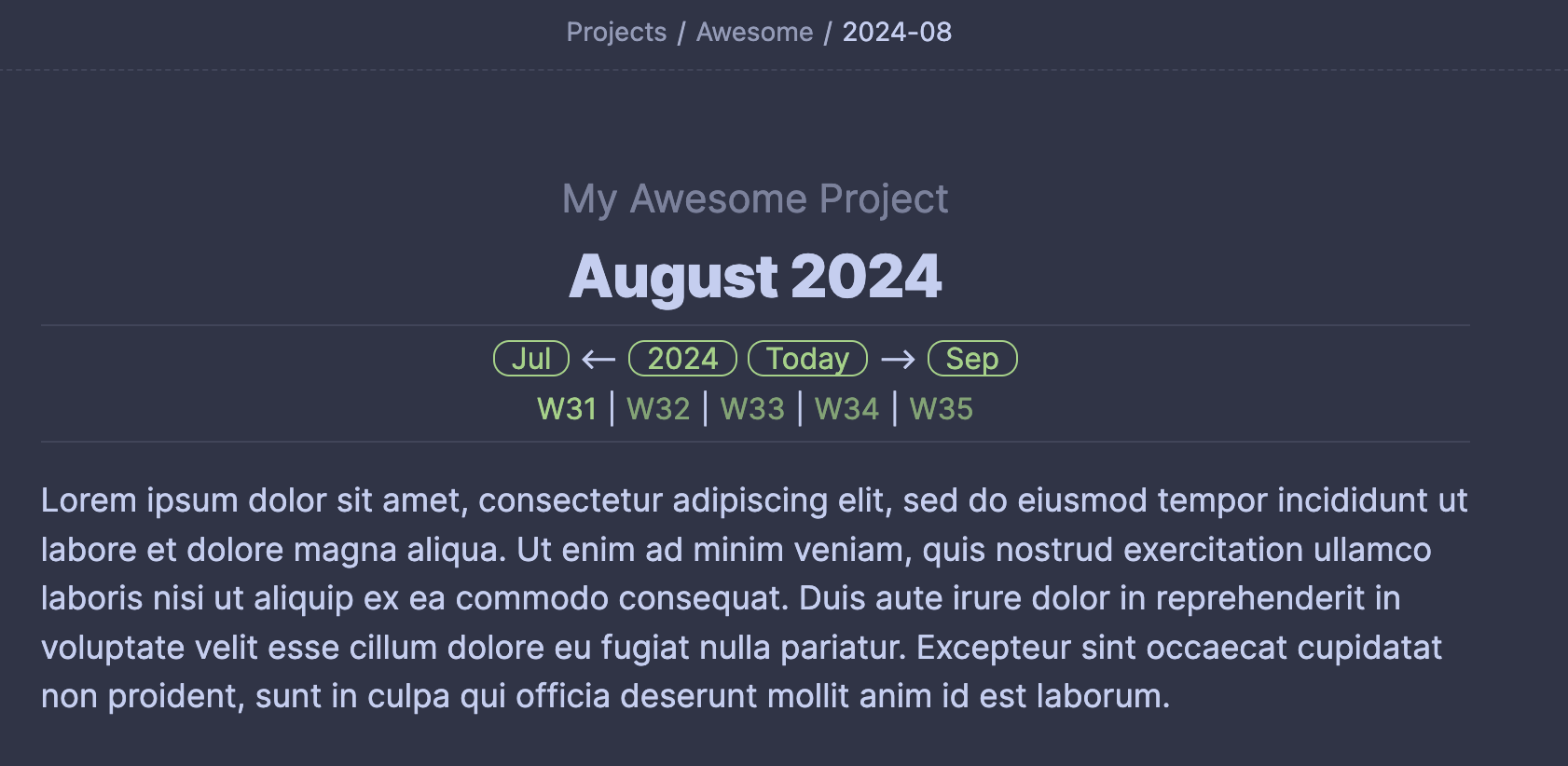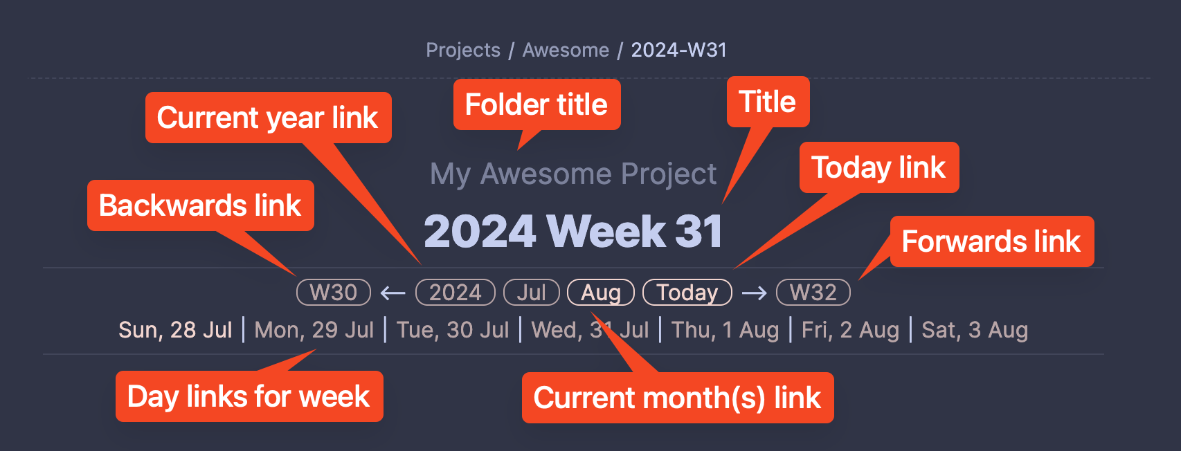 - If a note exists for the current note's week component, or if the current note's week component represents the current or a future week, a link to the week note is rendered.