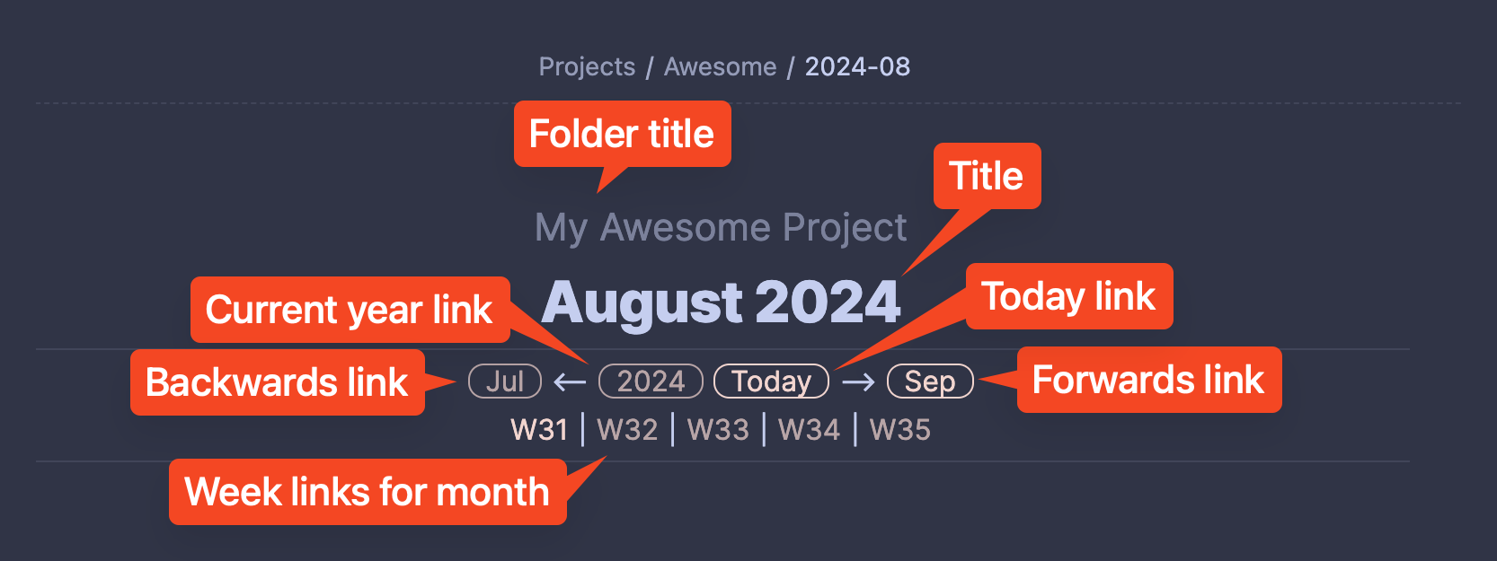 - Renders links or plain text labels for each week that falls in the current link's month.
