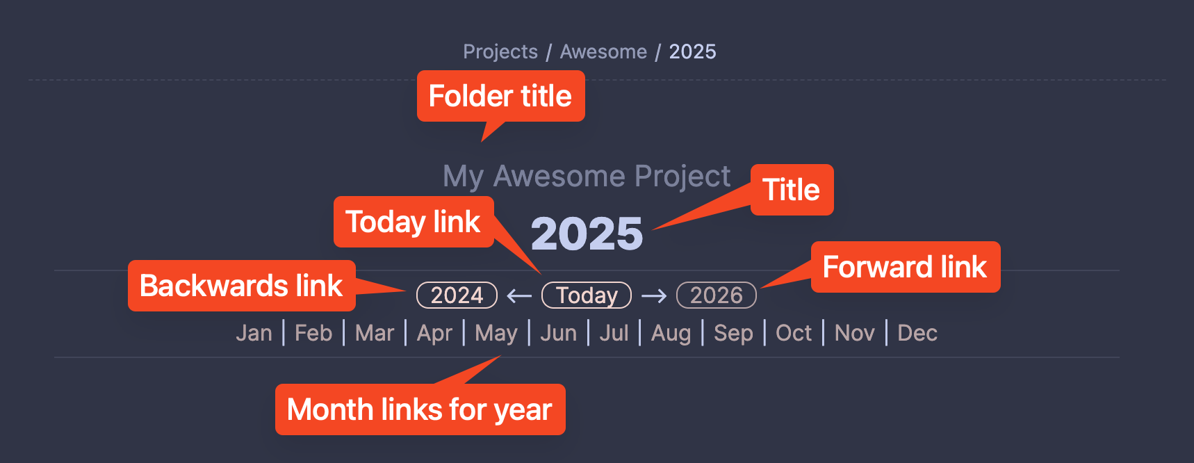 - If a note exists for the current note's year component, or if the current note's year component represents the current or a future year, a link to the year note is rendered.