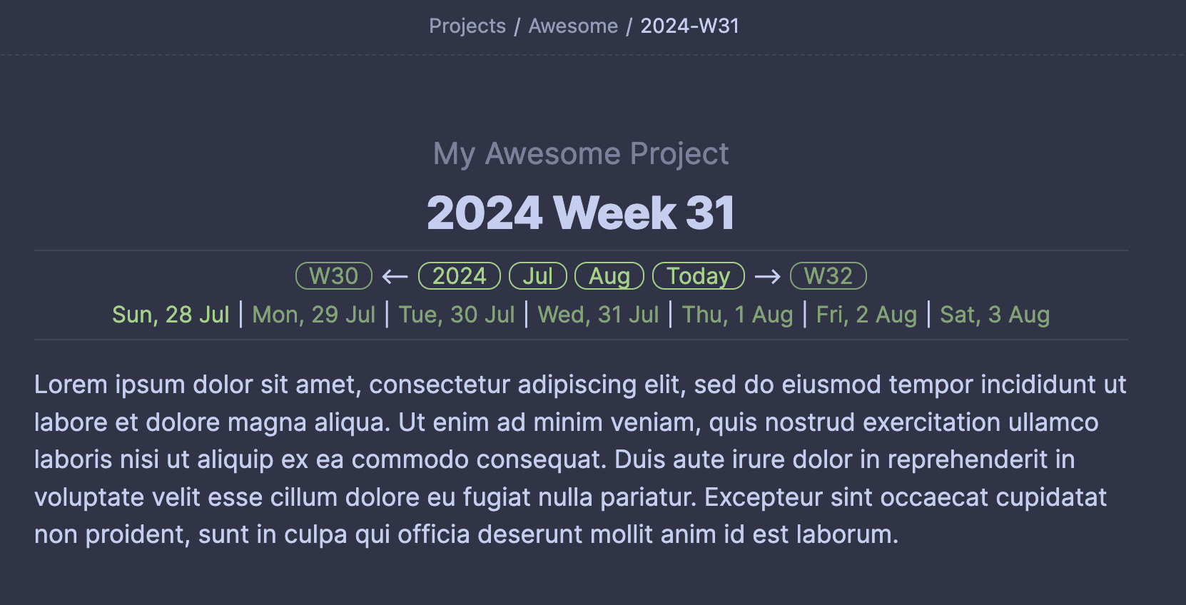 - Renders the week represented by the journal note, using the specified date format for the note type.