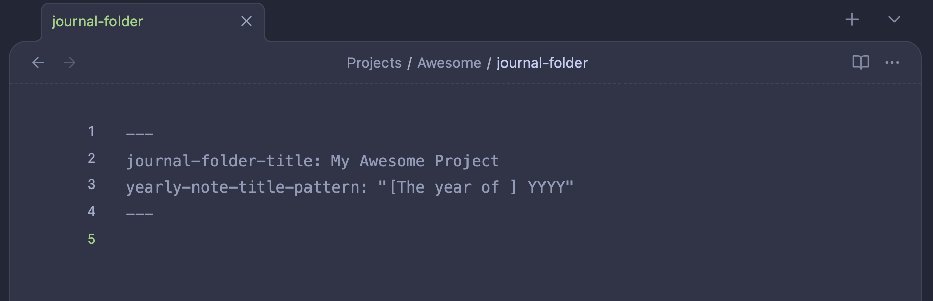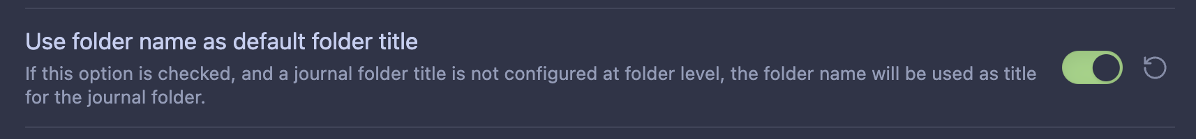 | journal-folder-title | The journal folder title is used in the rendering of journal headers as well as to identify the folder in other views. The journal folder title should typically be configured at folder level (i.e. as a front-matter property in the journal-folder note in the applicable folder). |