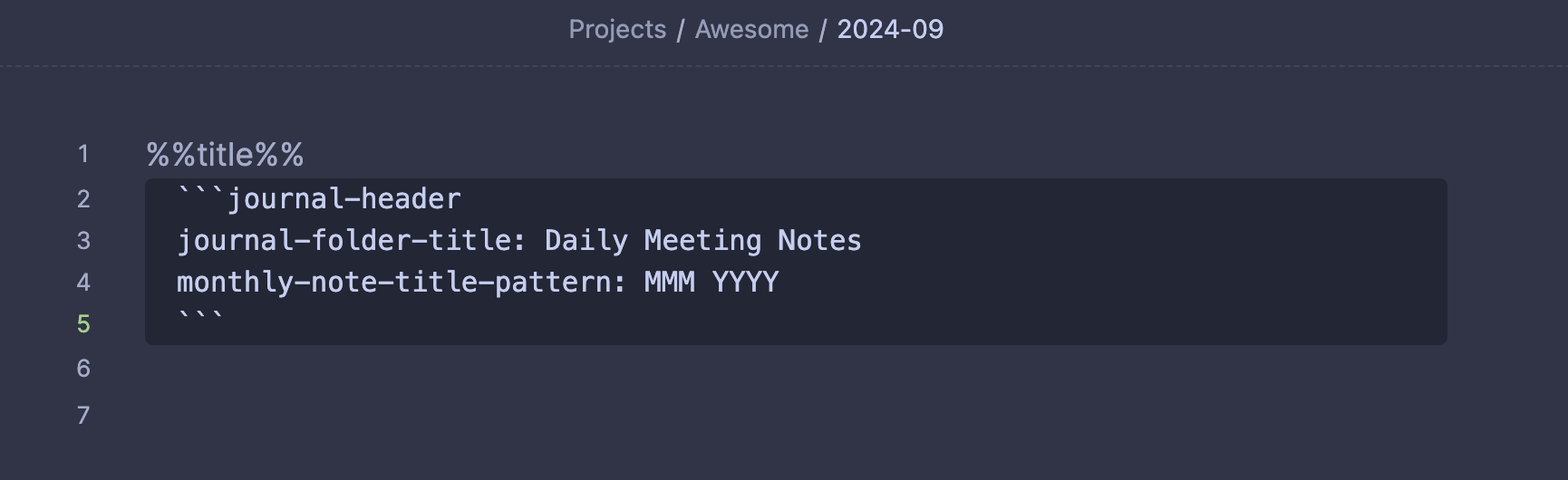 [!CAUTION] It should be noted that any settings configured in the code block will only apply to that code block. If for example the journal-folder-title property is configured within the code block, it will only effect the title rendered for that header and will not determine/override the actual title assigned to the folder.