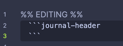 Note that the header will render correctly without the %% EDITING %% in the first line. It is however recommended to include a comment line for the following reason... If the journal-header code block is placed on the first line, whenever you open a document in edit mode, the cursor (which defaults to the first line in the file) will start off on the code block. This results in the code block being rendered instead of the title until the user moves the cursor off it. This behaviour can be a bit distracting.