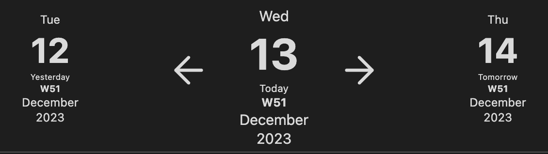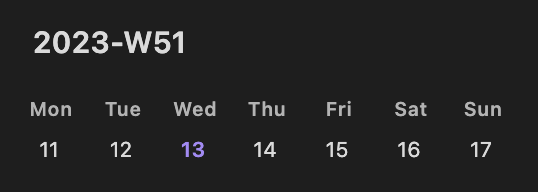 Timeline code blocks helps navigating daily notes in bigger periods (like week, month, quarter or year). By default daily and weekly notes show week timeline, monthly note - month timeline, quarter note - quarter timeline and yearly note - calendar timeline. This can be changed using mode param.