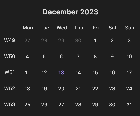 Week Numbers: Show week numbers before or after weekdays, or hide them