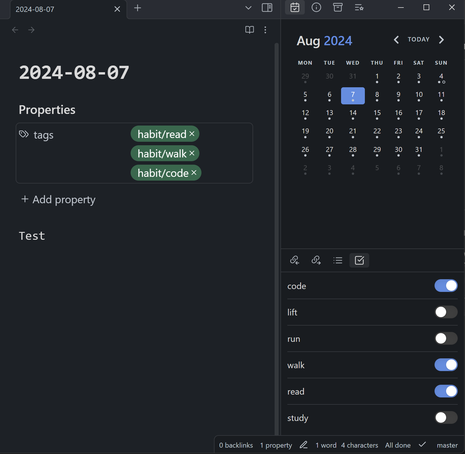 - Configure your habits. Each habit will set a tag in the current document with the following name:
