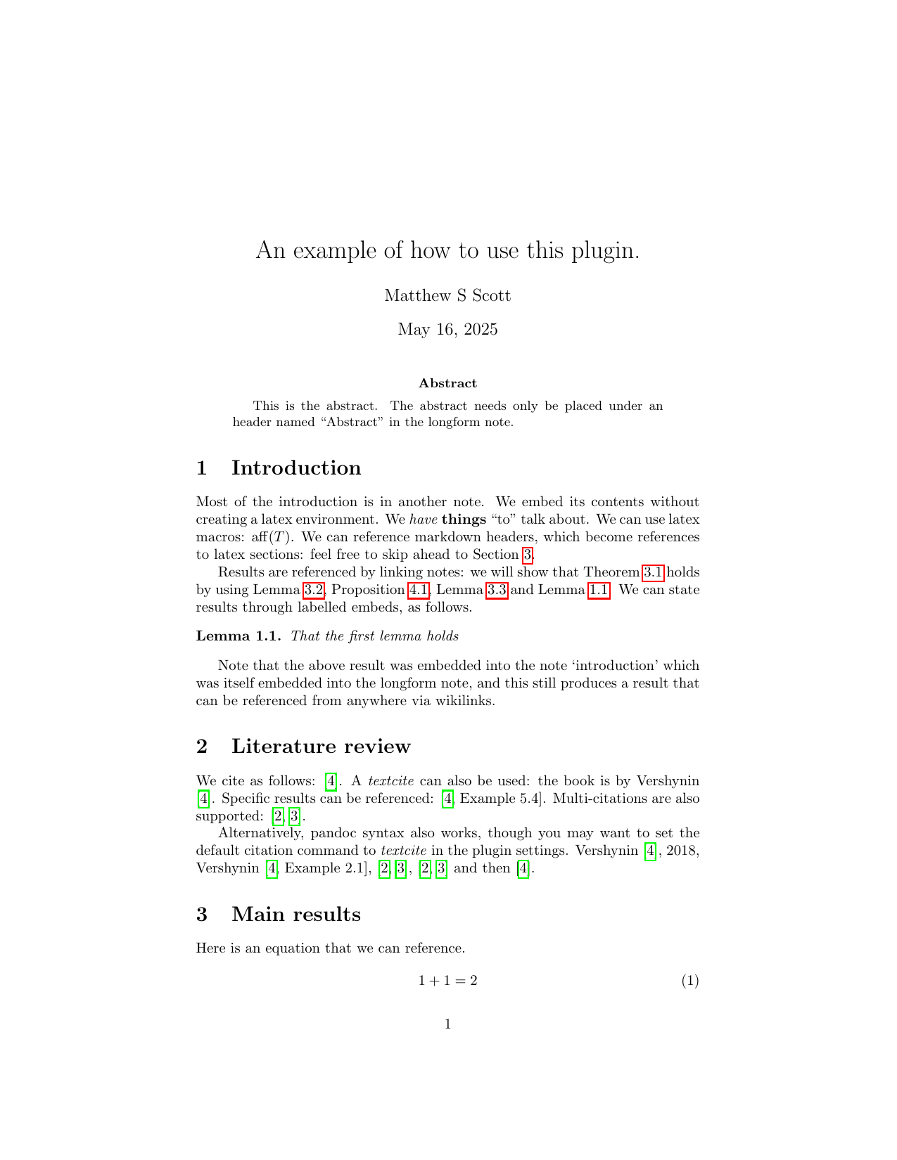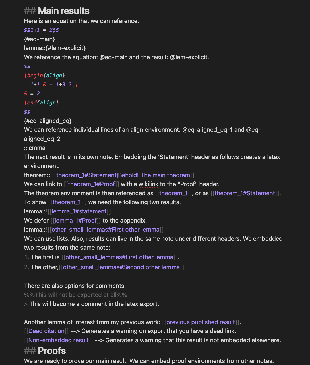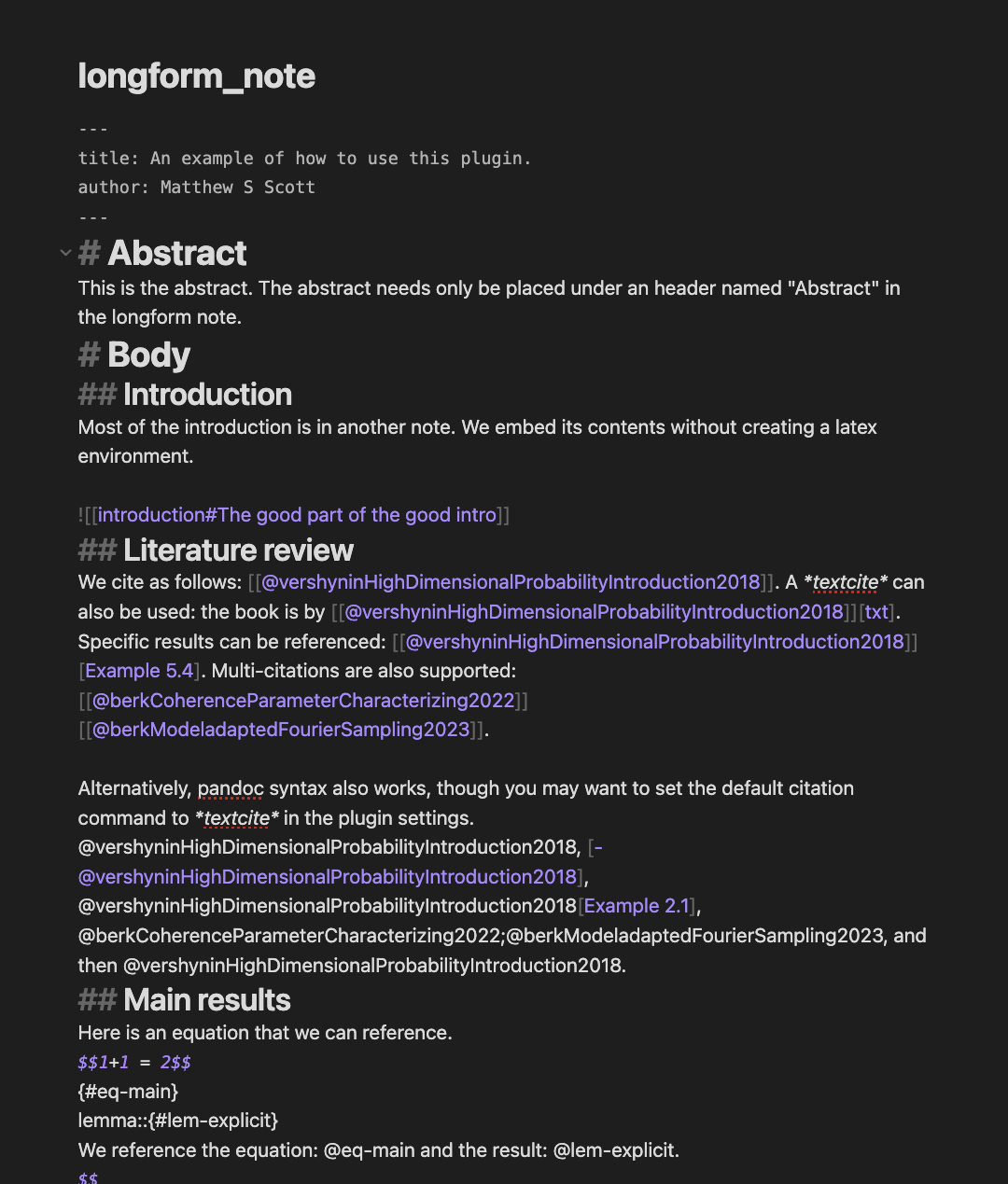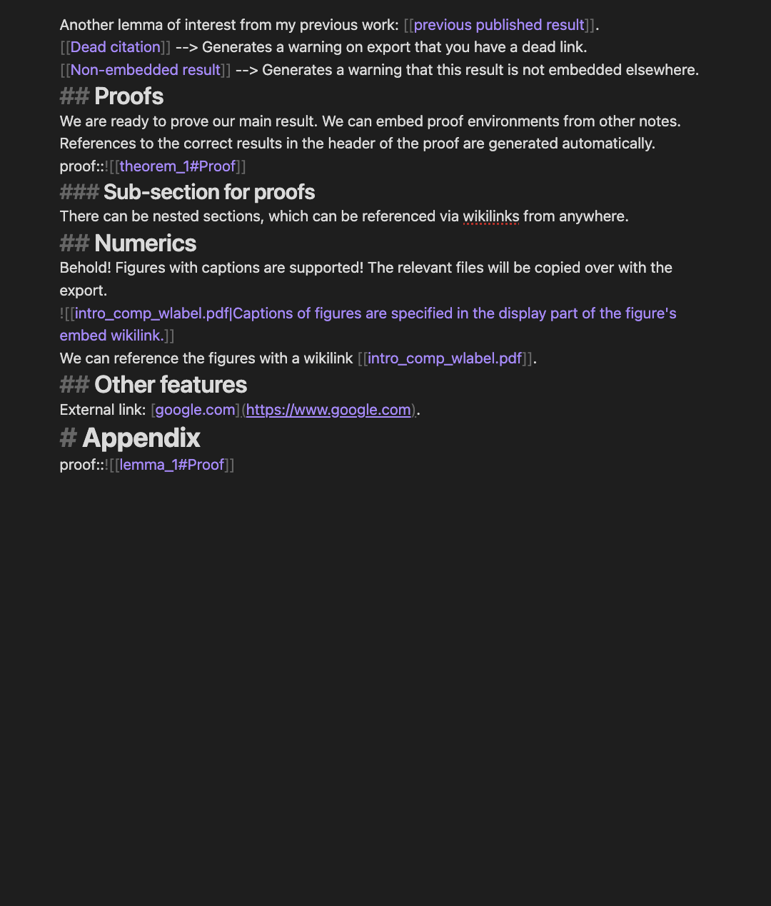 you may want to include the statement of the theorem in the introduction by writing theorem::![[theorem_note#Statement]] on a new line. You would like to defer the proof to a later section. In that later section, you embed the proof by writing proof::![[theorem_note#Proof]]. Hyperlinks between the theorem and the proof will be automatically generated when exporting the longform note. What about referencing this theorem? For this you should use a standard wikilink, [[theorem_note]]. Note that the embedding structure can be recursive; as long as the content is visible in Obsidian from the longform note, it will be included in the export. If we think of the individual Markdown files, this means that an embedding statement like theorem::![[theorem_note#Statement]] may be situated within some third note third_note.md, which is itself embedded into the longform note, and the two-layers-deep content will still be fetched and added to the exported file.