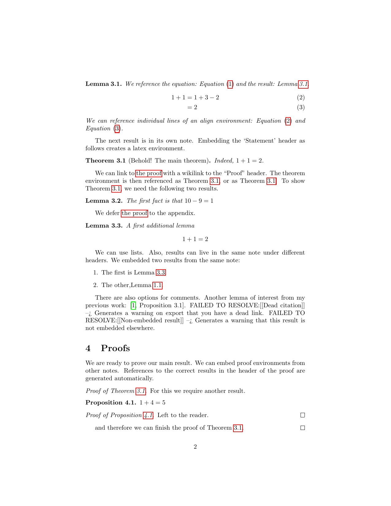 Results embedded in this way are referenced with wikilinks: [[markdown_base_file_name]]. The generated LaTeX label of an embedded environement depends on both the note of origin and the header of origin of the embedded content. This means you may choose to have many results in the same note, under different headers. If no header is specified in the referencing wikilink, the plugin defaults to a possible Statement header, i.e., it is no different than if the wikilink was of the form [[markdown_base_file_name#Statement]]. Other headers can be used, e.g. lemma::![[markdown_base_file_name#Other Statement]]. Such a result can be referenced with [[markdown_base_file_name#Other Statement]]. However, only a Statement header has an implicit association with a possible Proof header in the same file.