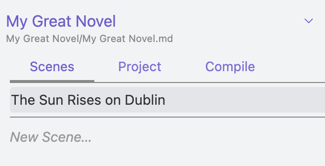 - That New Scene placeholder is a text field—click it and enter something that sounds like the first scene of a novel, maybe “The Sun Rises on Dublin,” and press enter. You should now be editing a so-named note, and your scene should appear in the Scenes tab:
