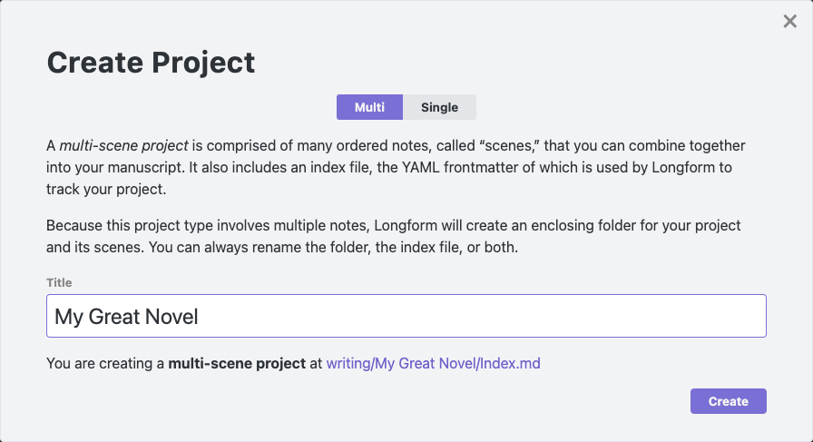 Create Projectmodal will appear. This modal lets us choose between Multi- and Single-scene project types. We’re creating a novel, so we’ll stick with Multi. The text under the project type switch explains a little about how each type of project works. -