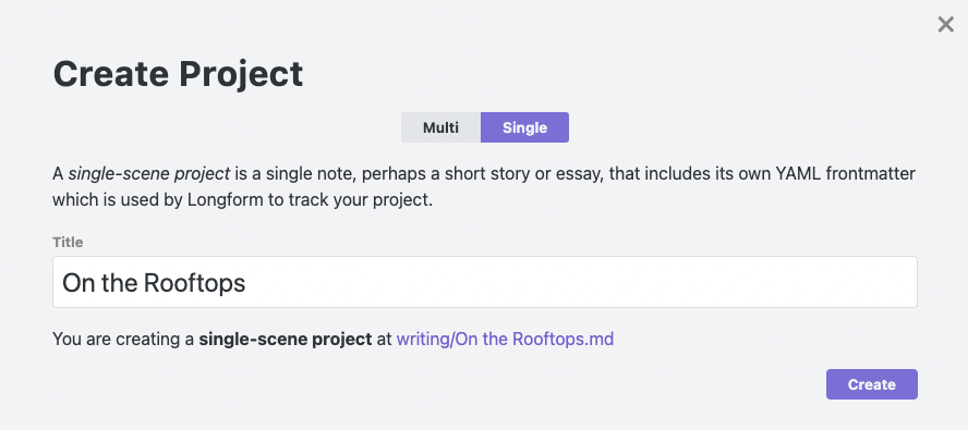 Longform also supports single-scene projects that live as a single note in your vault. Let’s create one.