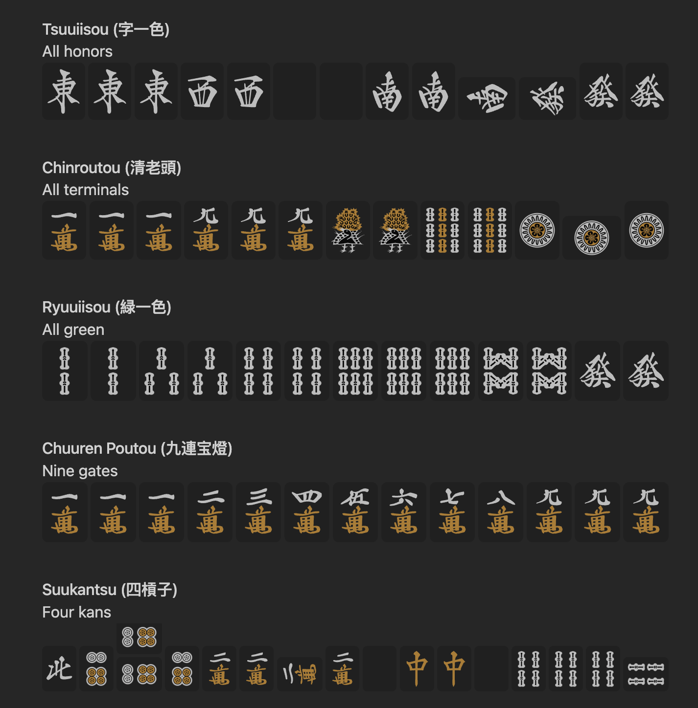 | s | Sou (Bamboo) suits: 1s, 2s, ..., 9s |
