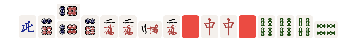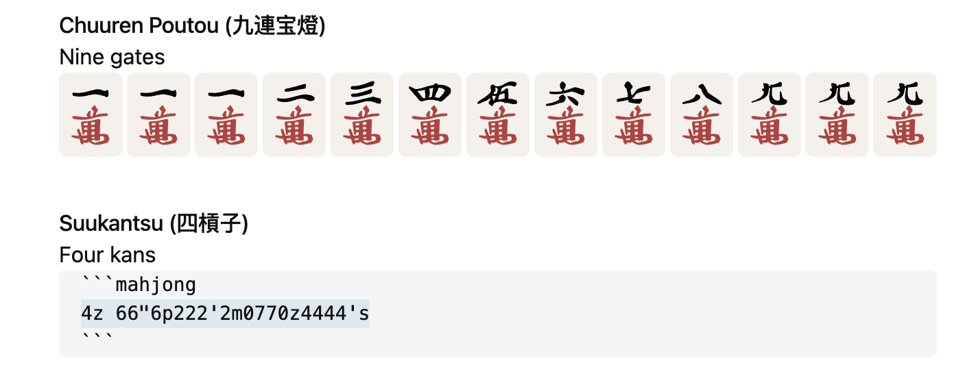 This shows an open kan of 5-pin. Multiline Rendering For complex hands or to show discarded tiles, you can use multiple lines. Each line is separated by a space.