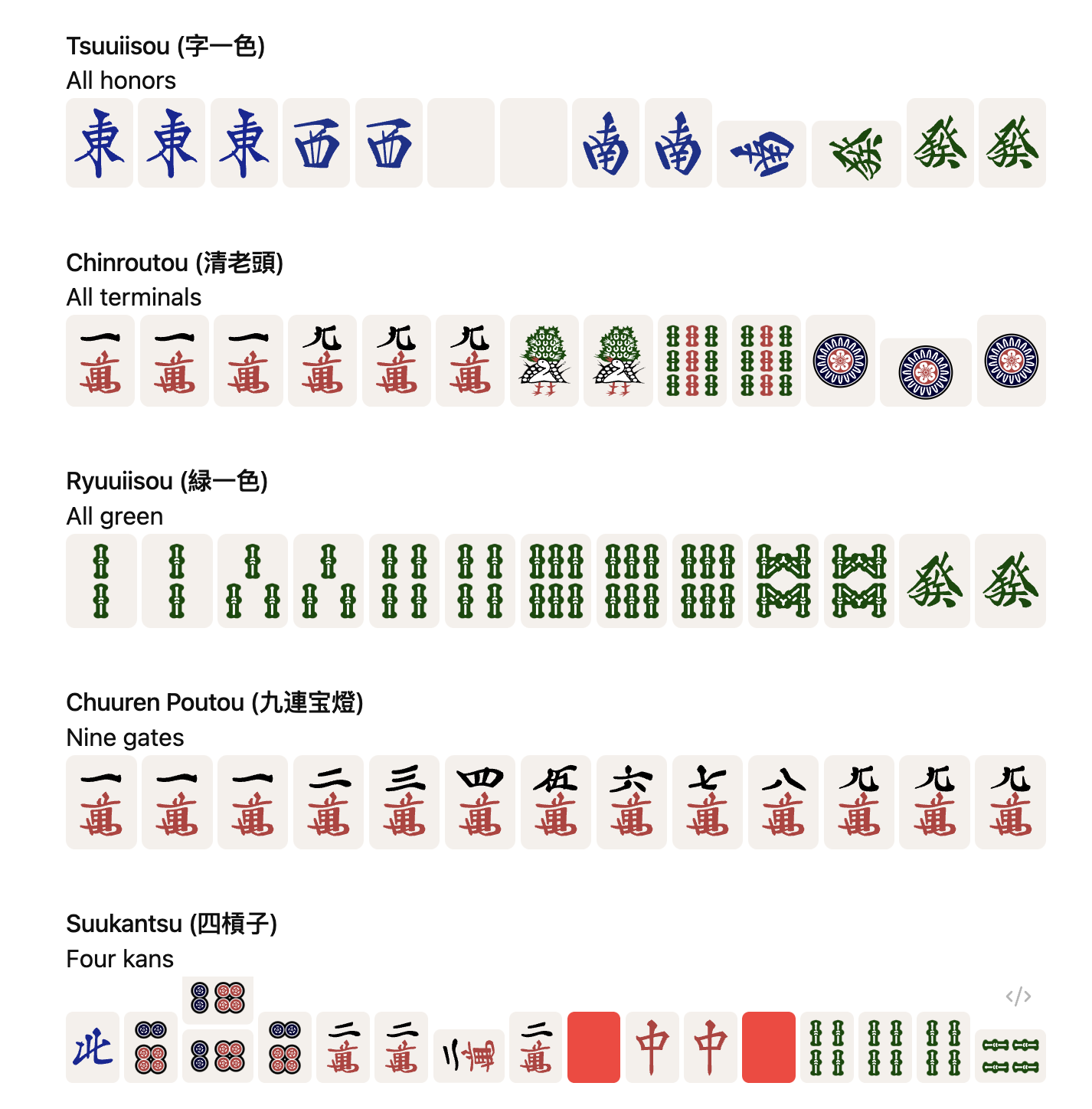 | z | Honor tiles: 1z (East), 2z (South), 3z (West), 4z (North), 5z (White), 6z (Green), 7z (Red) |