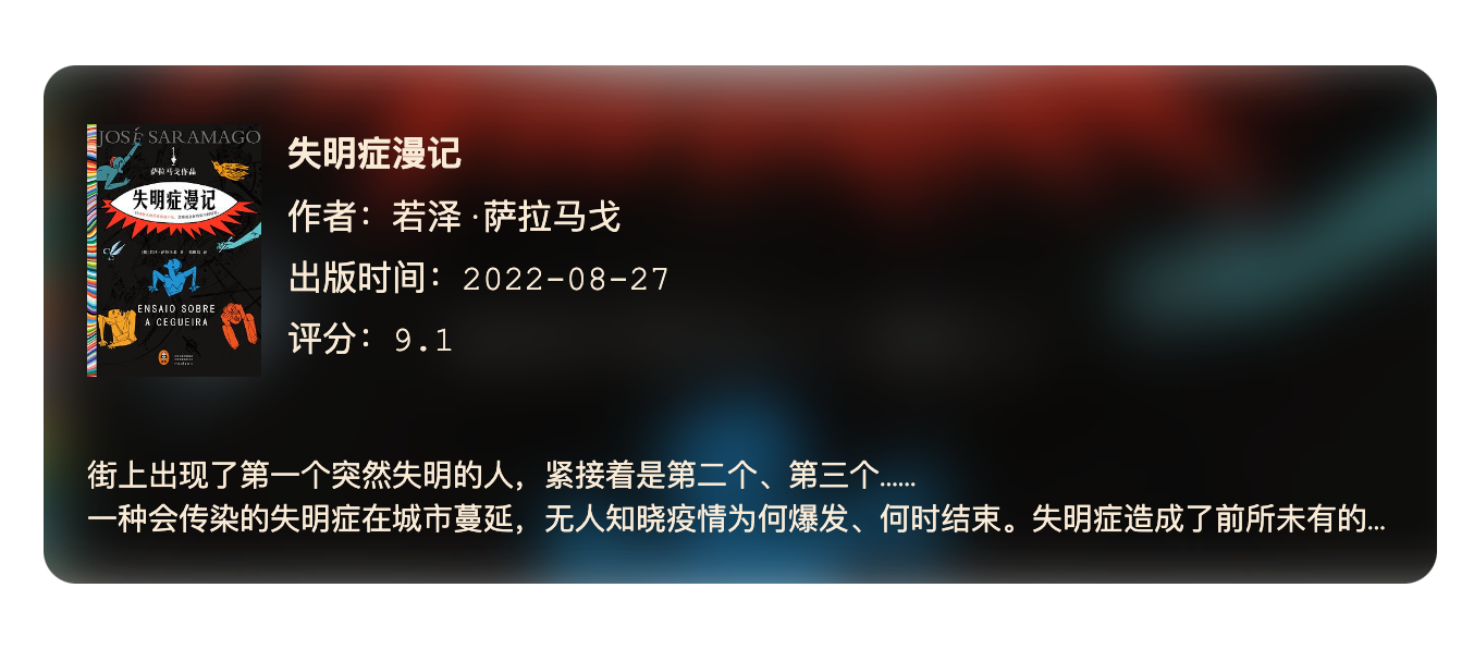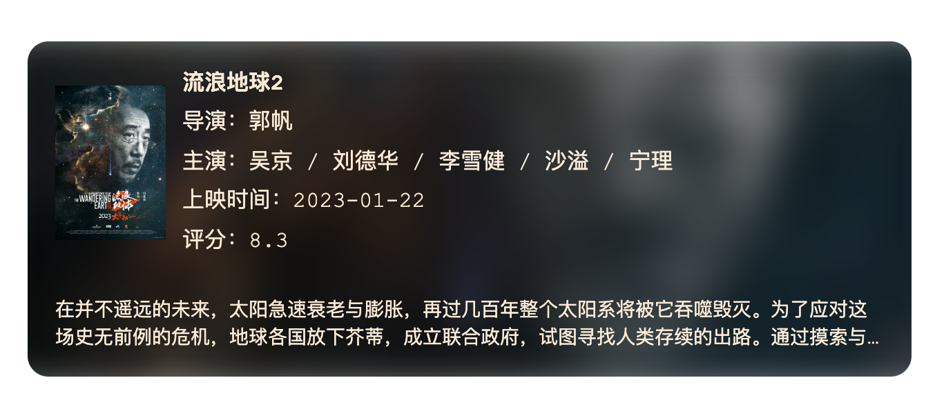 This project was inspired by hexo-douban-card and references the design and implementation of the card style. However, it does not have the ability to fetch Douban information. Instead, it allows users to freely configure the content displayed on the card, which can be completely unrelated to Douban.
