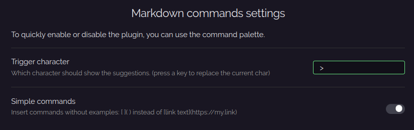 Trigger characterSet the character that will trigger the commands.Simple commandsInsert commands without examples.
