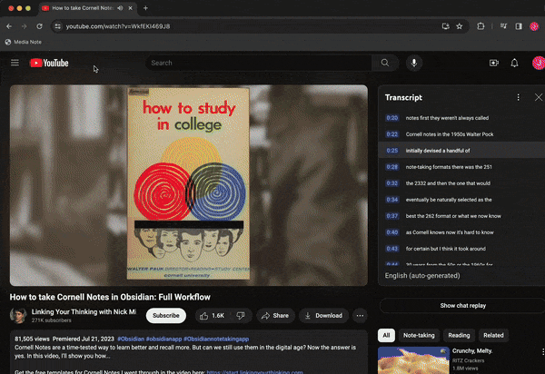 Take notes on YouTube videos and podcasts with media controls and timestamps.