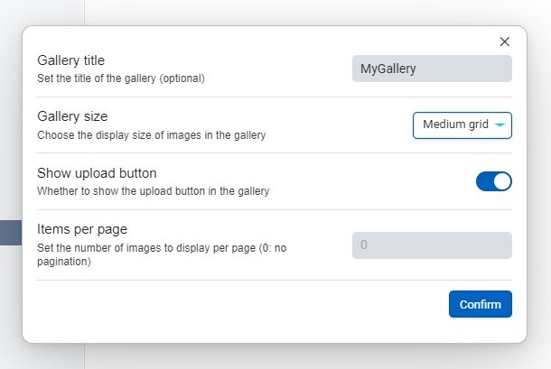 pagination: number | Display pagination when the number of images in the Gallery exceeds this number |