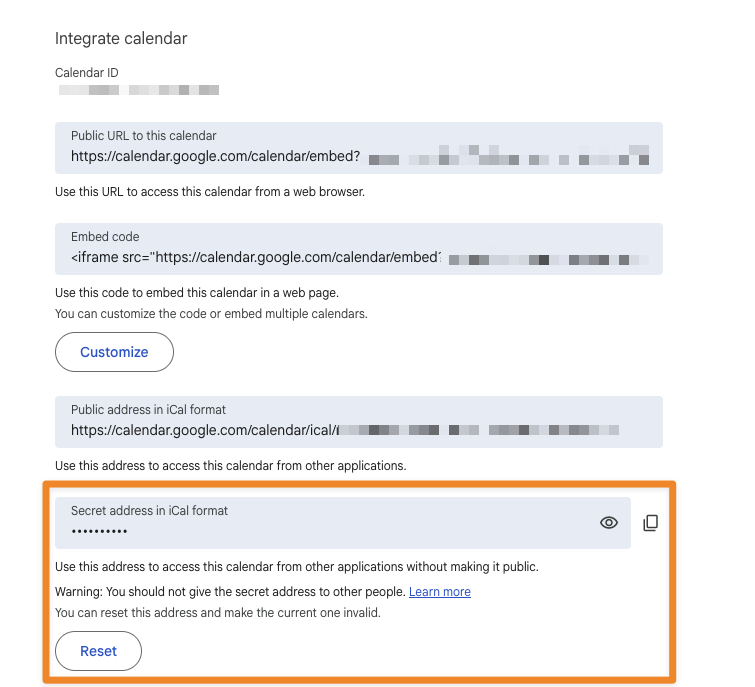 - Copy the Secret address in iCal format (recommended) or Public address in iCal format