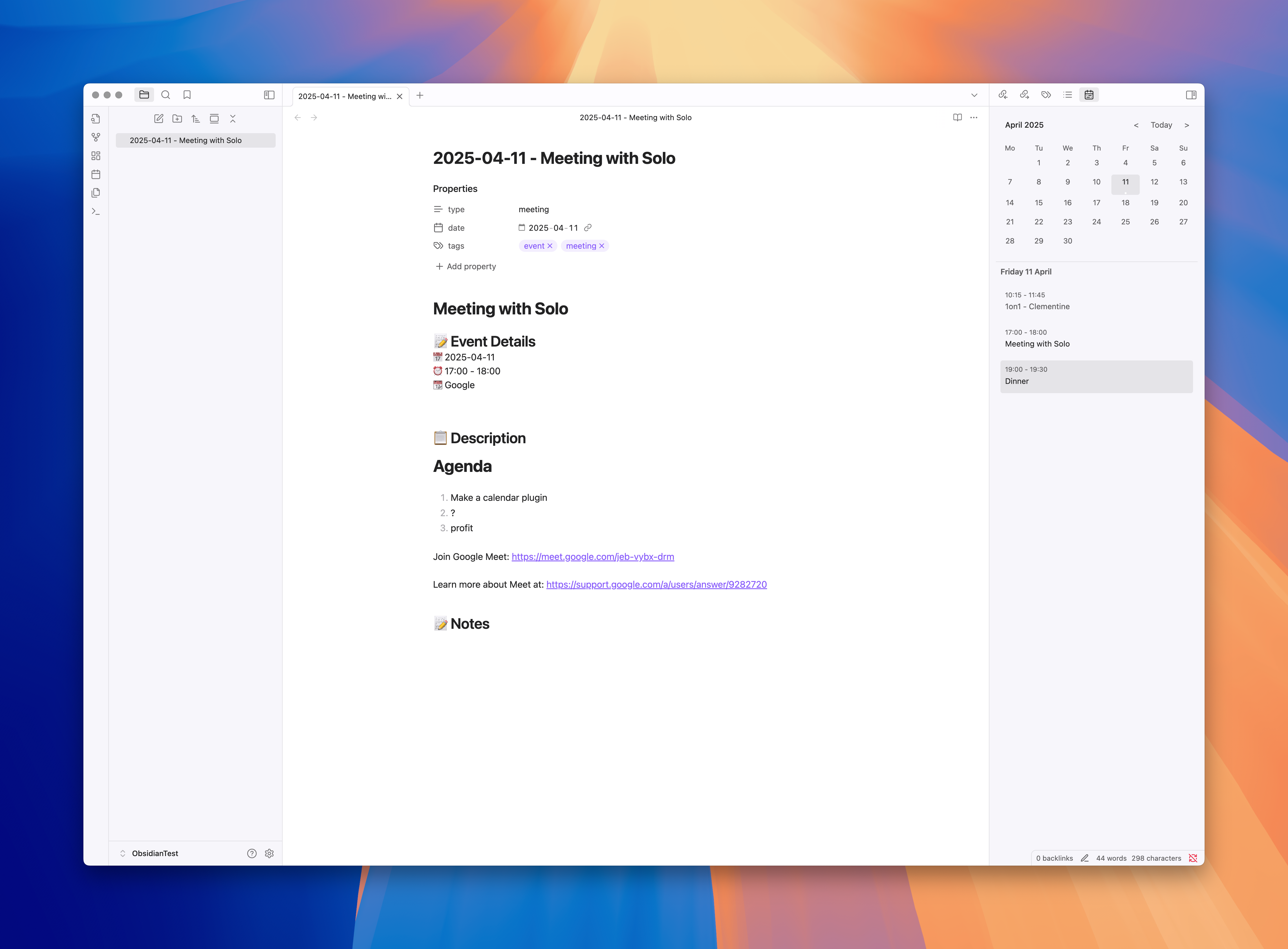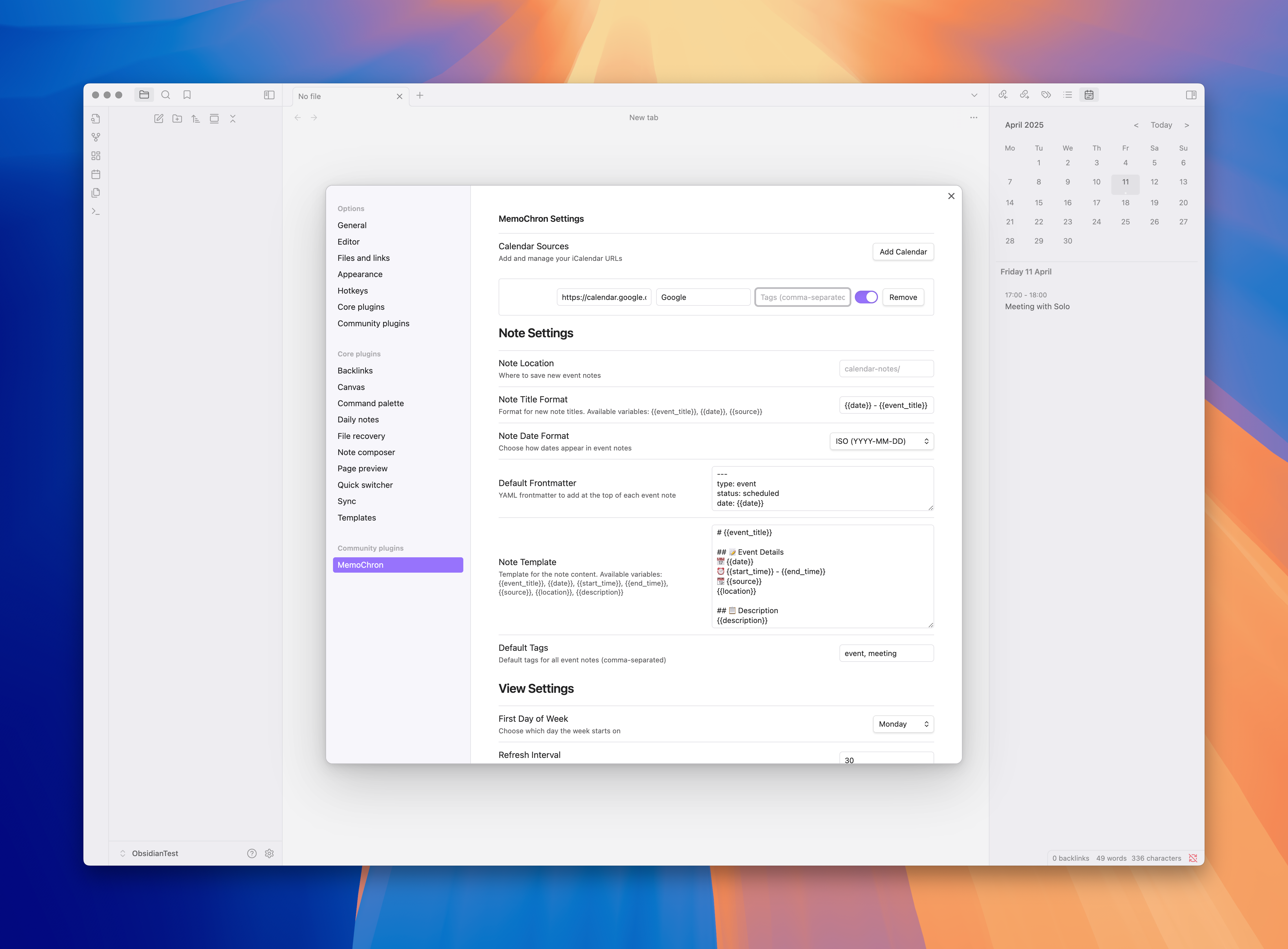 MemoChron is an Obsidian plugin that bridges the gap between personal knowledge management and time management. It showcases a list of your calendar events. When you click on an event, it creates a note for this event.