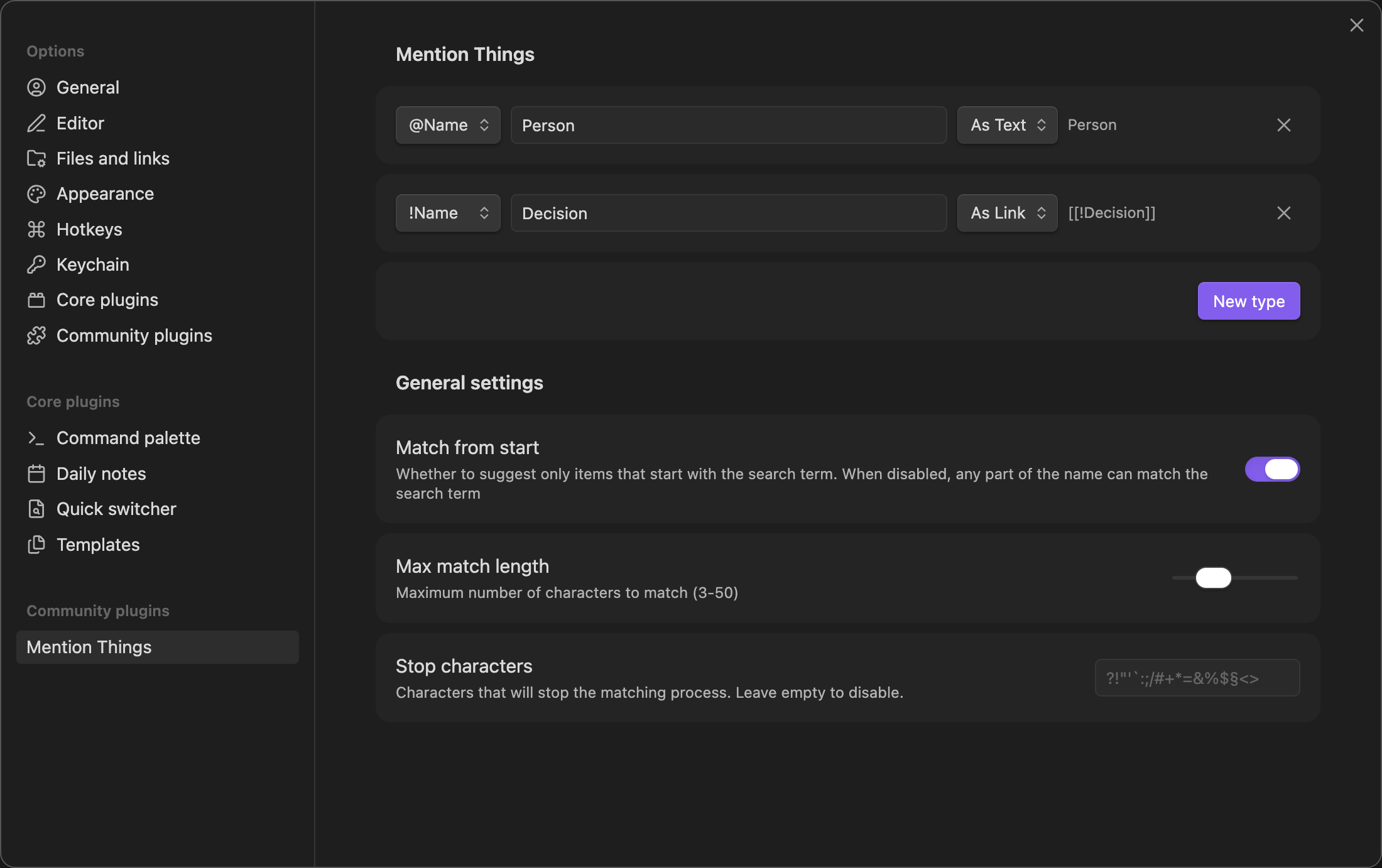 Max match length - Limits how many characters you can type before suggestions stop appearing. Prevents suggestions from showing when typing longer text that happens to start with a mention character.