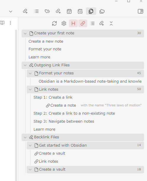 - Lists the outlines of the active file, its outgoing link files, and its backlink files. That is, it outlines the local graph at depth 1 (backlink files of those files, so-called 2-hop links, can also be displayed).