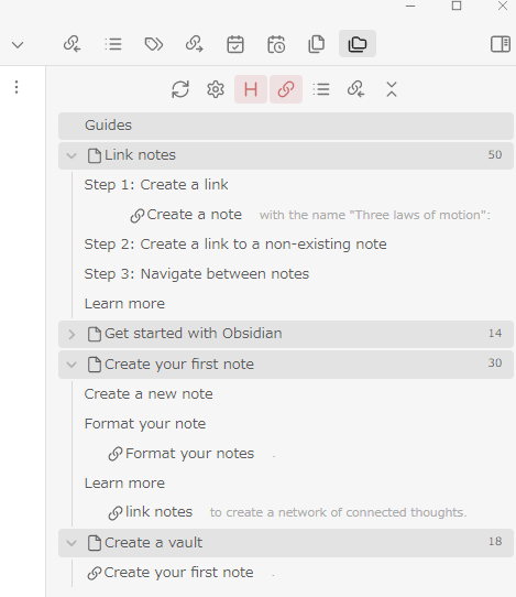 H, リンク、リスト、バックリンクのアイコンはそれぞれのアウトライン要素の表示/非表示を切り替えます。