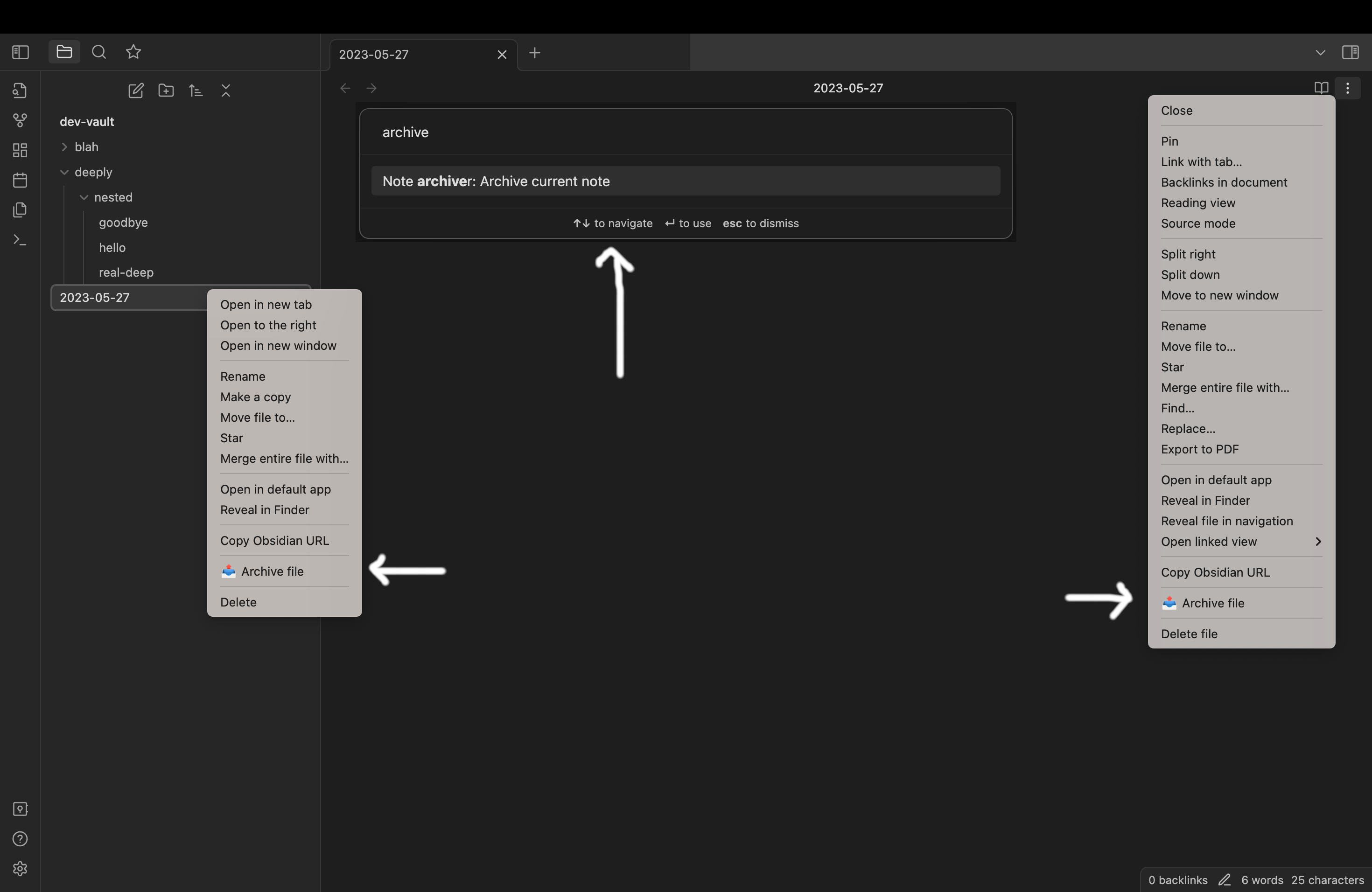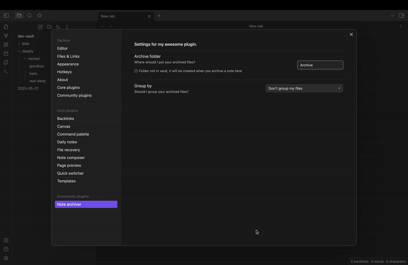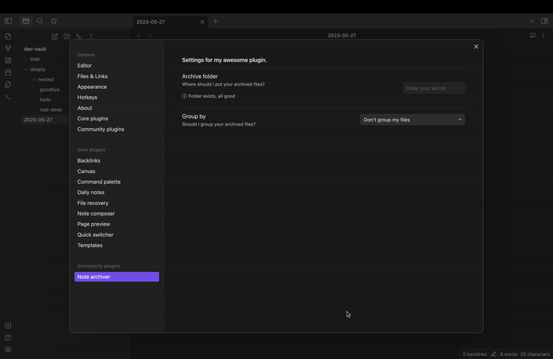 This is a simple note archiver utility. Some of my workflows need to move files to different locations so I can keep my workspace clean. This plugin helps move those documents to an archive folder