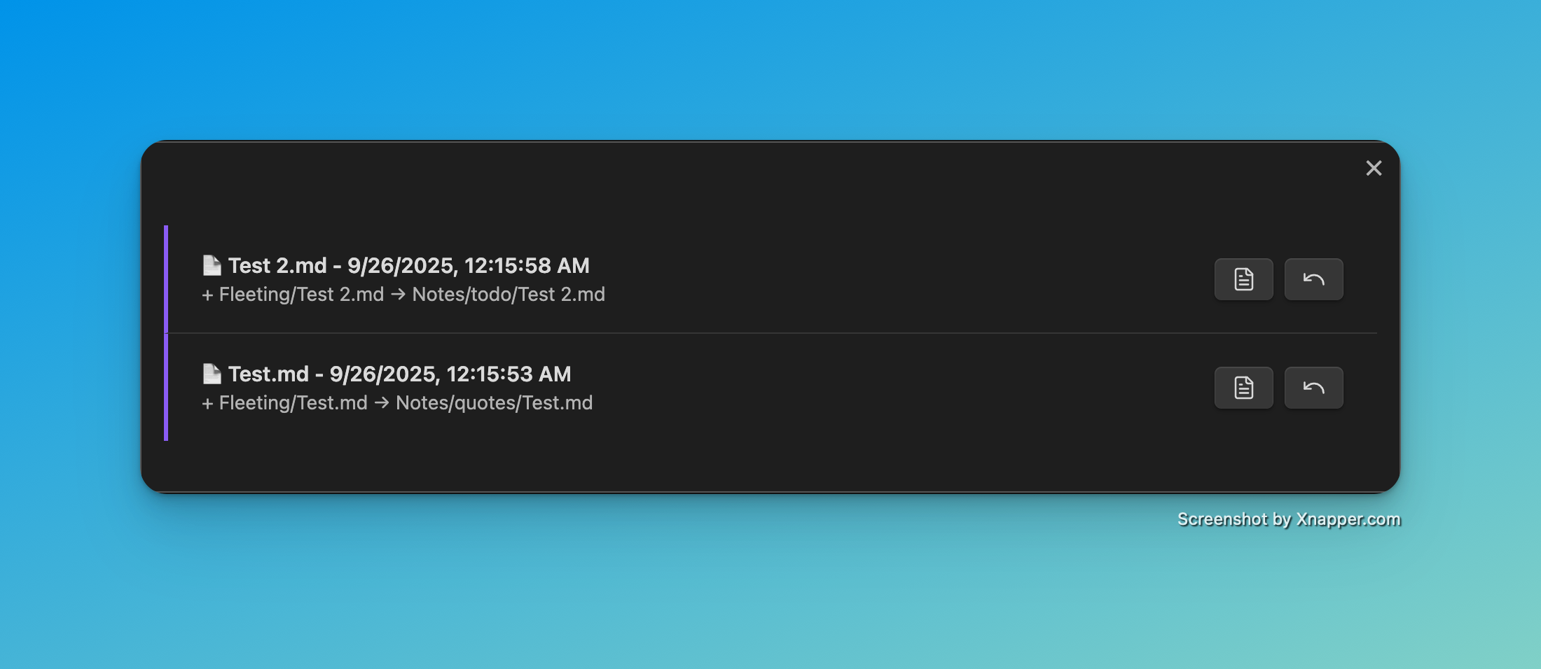 - Description: Displays a history of all file movements performed by the plugin, allowing you to review and undo previous actions.