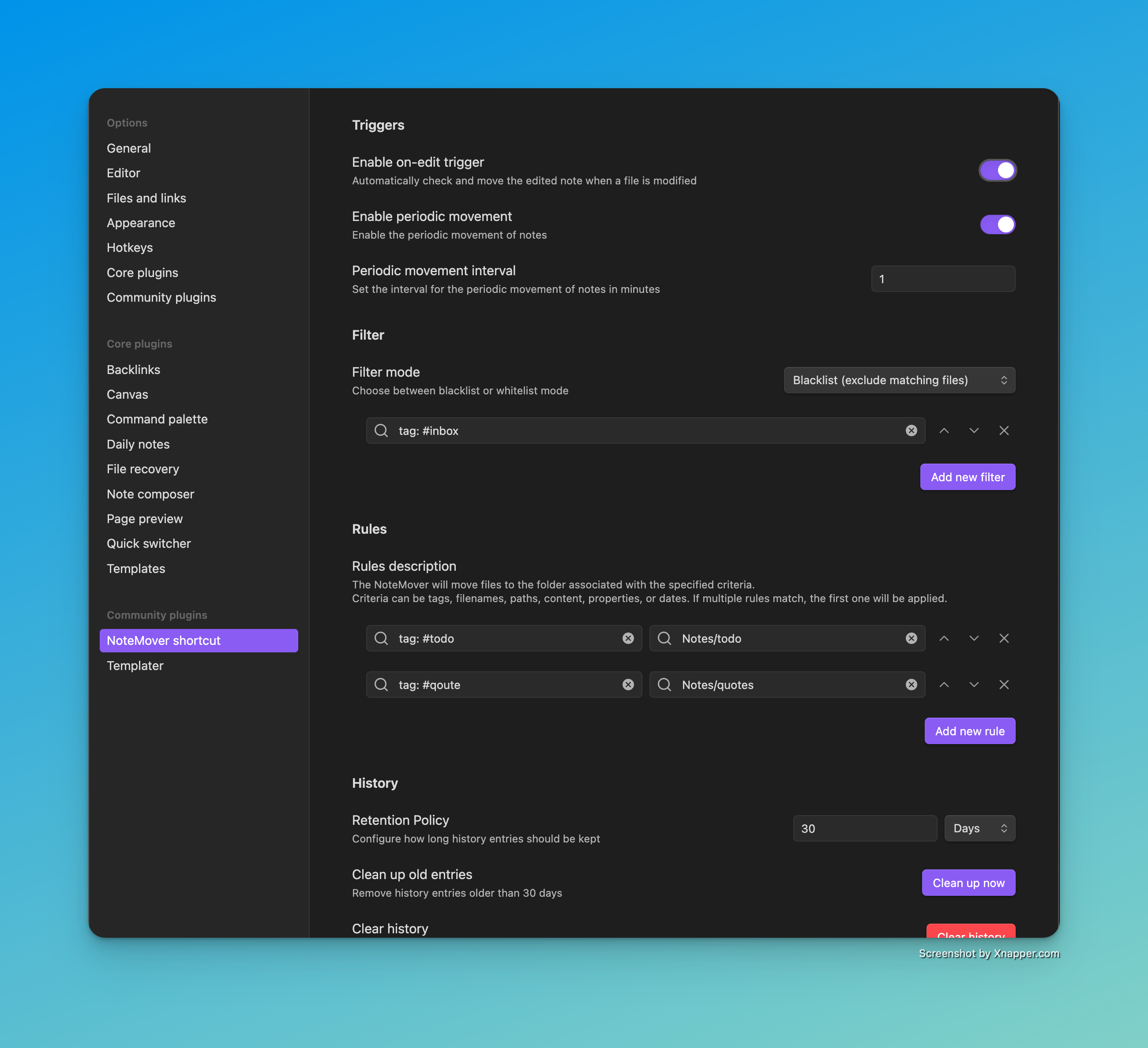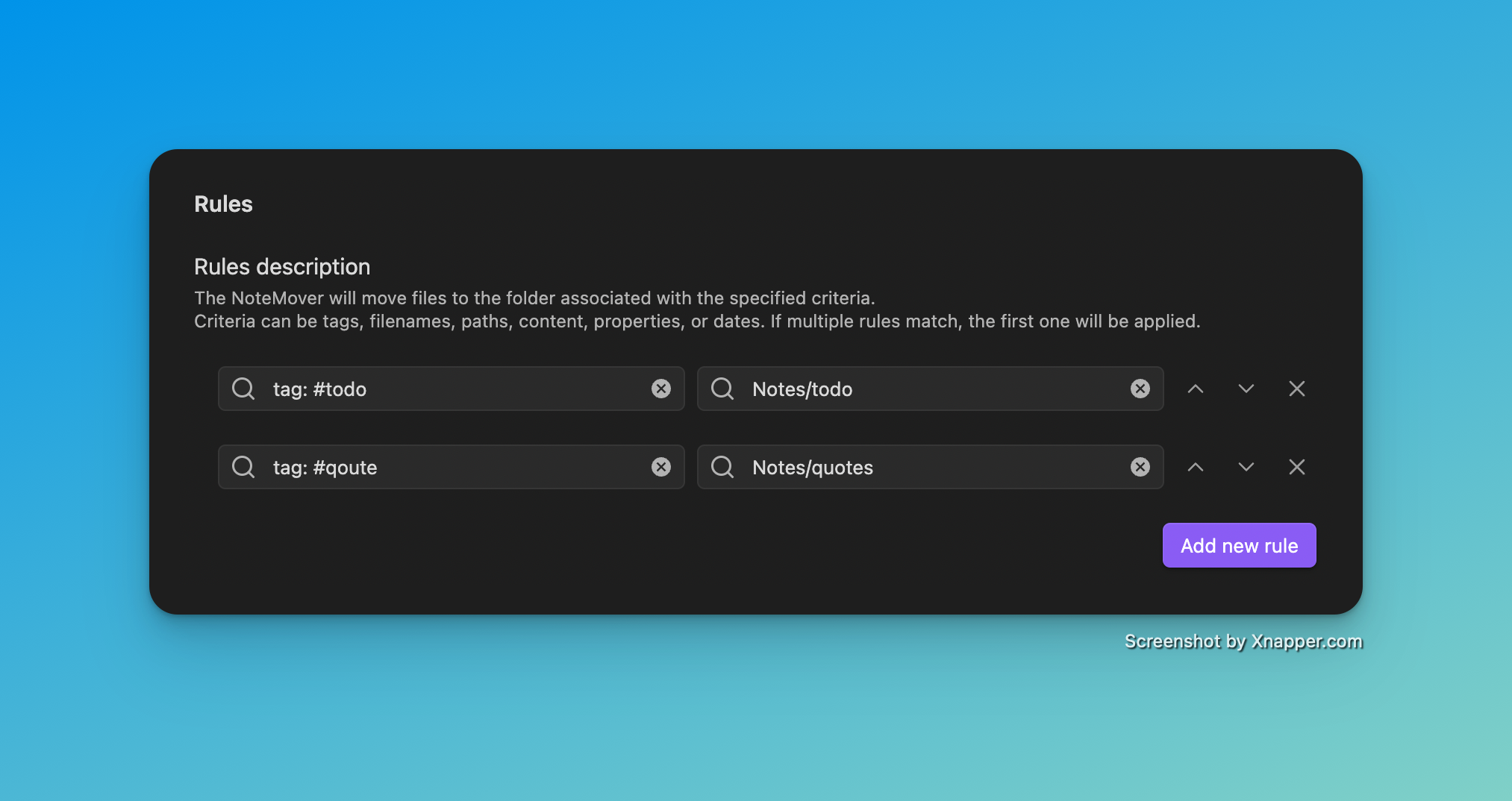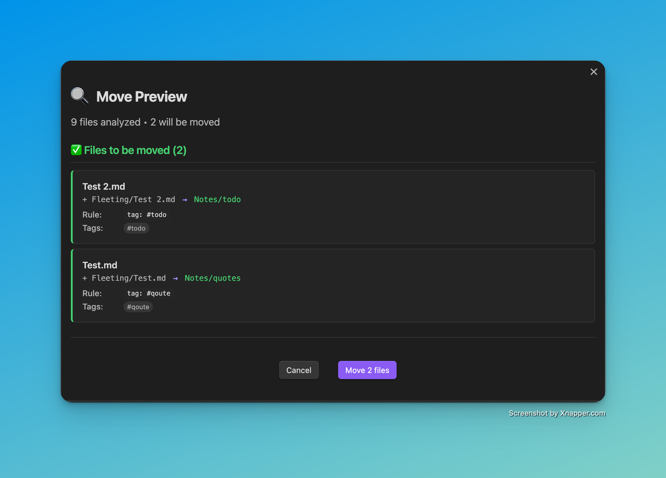 - Advanced Criteria-Based Moving: Move files to different destination folders based on various criteria including tags, properties (frontmatter), file names, content, paths, and dates, allowing for sophisticated file organization.