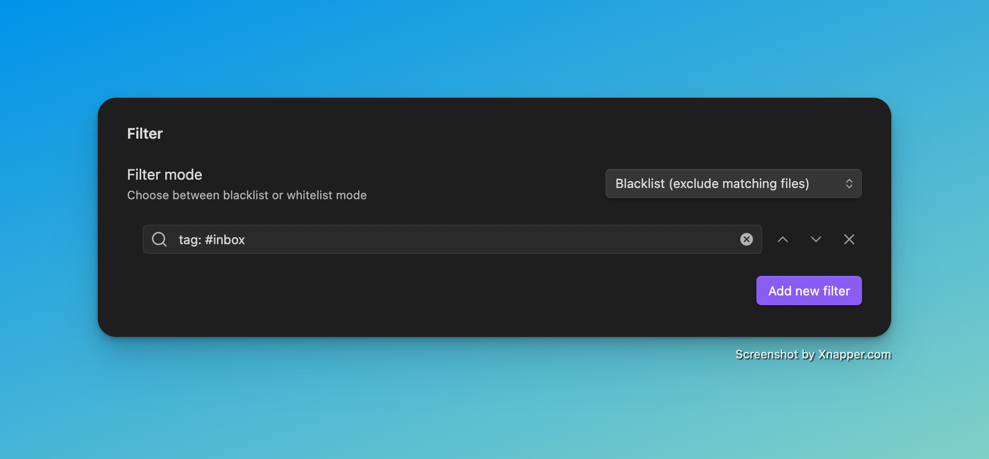 tag: tagname- Match files with specific tags (e.g.,tag: #inbox,tag: work/project) - Properties: Property-based criteria from frontmatter: