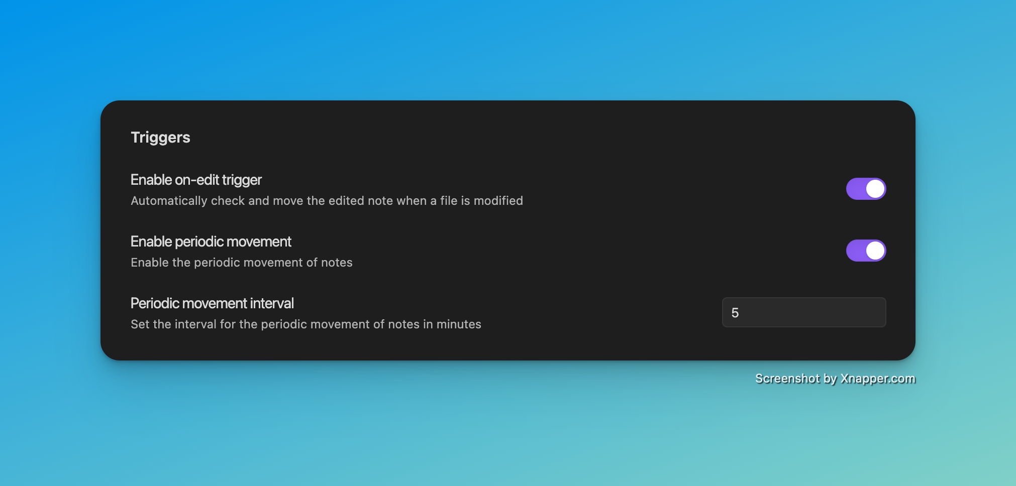- Enable periodic movement: When enabled, the plugin will automatically move all files in your vault at regular intervals.