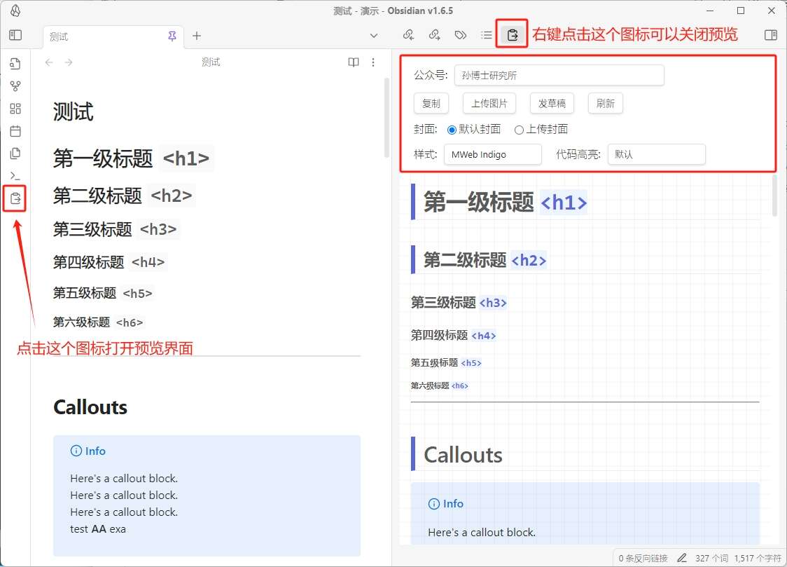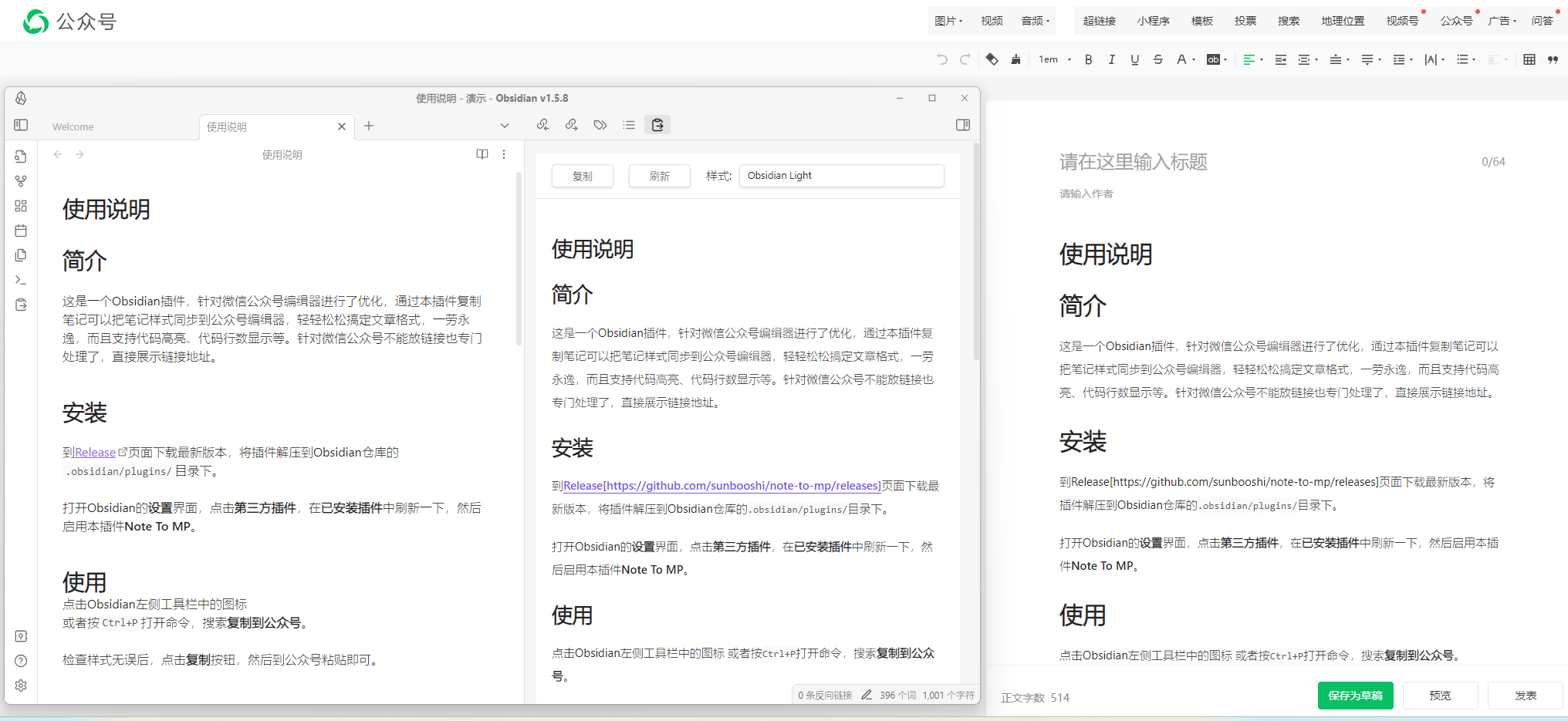 这是一个Obsidian插件,针对微信公众号编缉器进行了优化,通过本插件复制笔记可以把笔记样式同步到公众号编缉器,轻轻松松搞定文章格式,一劳永逸,而且支持代码高亮、代码行数显示、主题背景颜色等。针对微信公众号不能放链接也专门处理了,提供直接展示链接地址和文末脚注展示两种方式。本项目初衷仅是为了能够将Obsidian中笔记的样式完美同步到微信公众号的编辑器中,因此项目重点在于保证文章格式的一致性,而不是成为一个微信公众号编辑器。