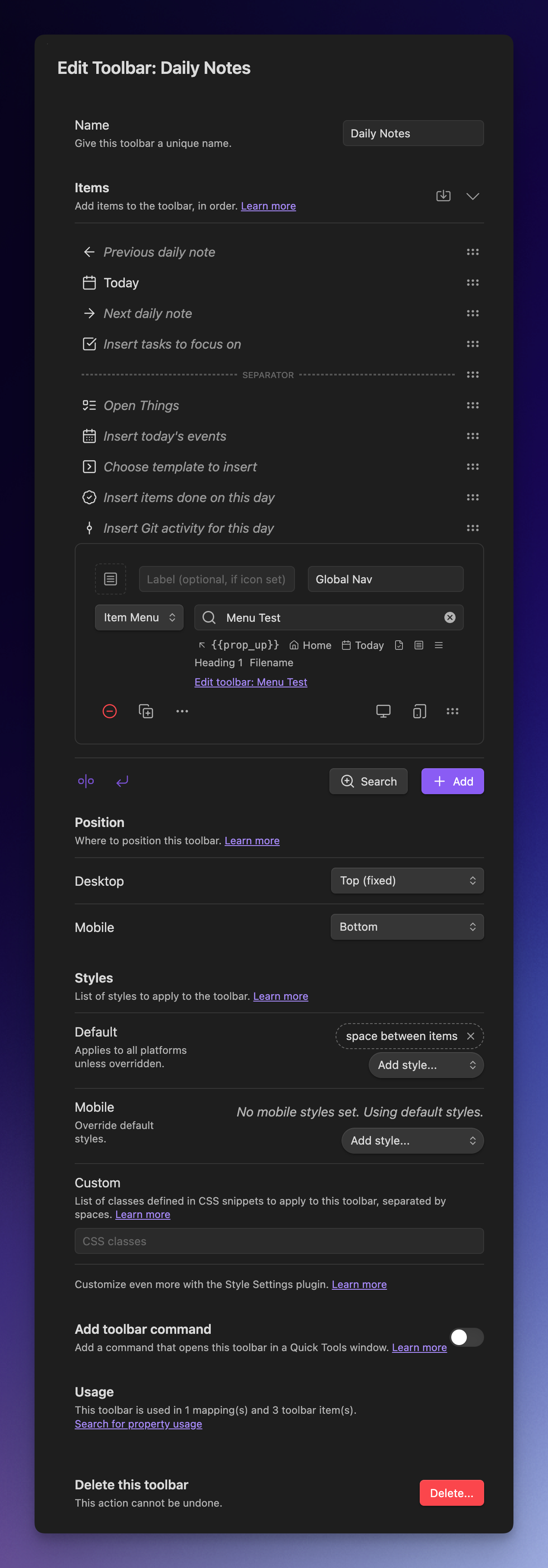- Create toolbars with items that link to commands, files/folders, URIs/URLs, menus, and scripts (Dataview, JS Engine, Templater, and built-in support for JavaScript).