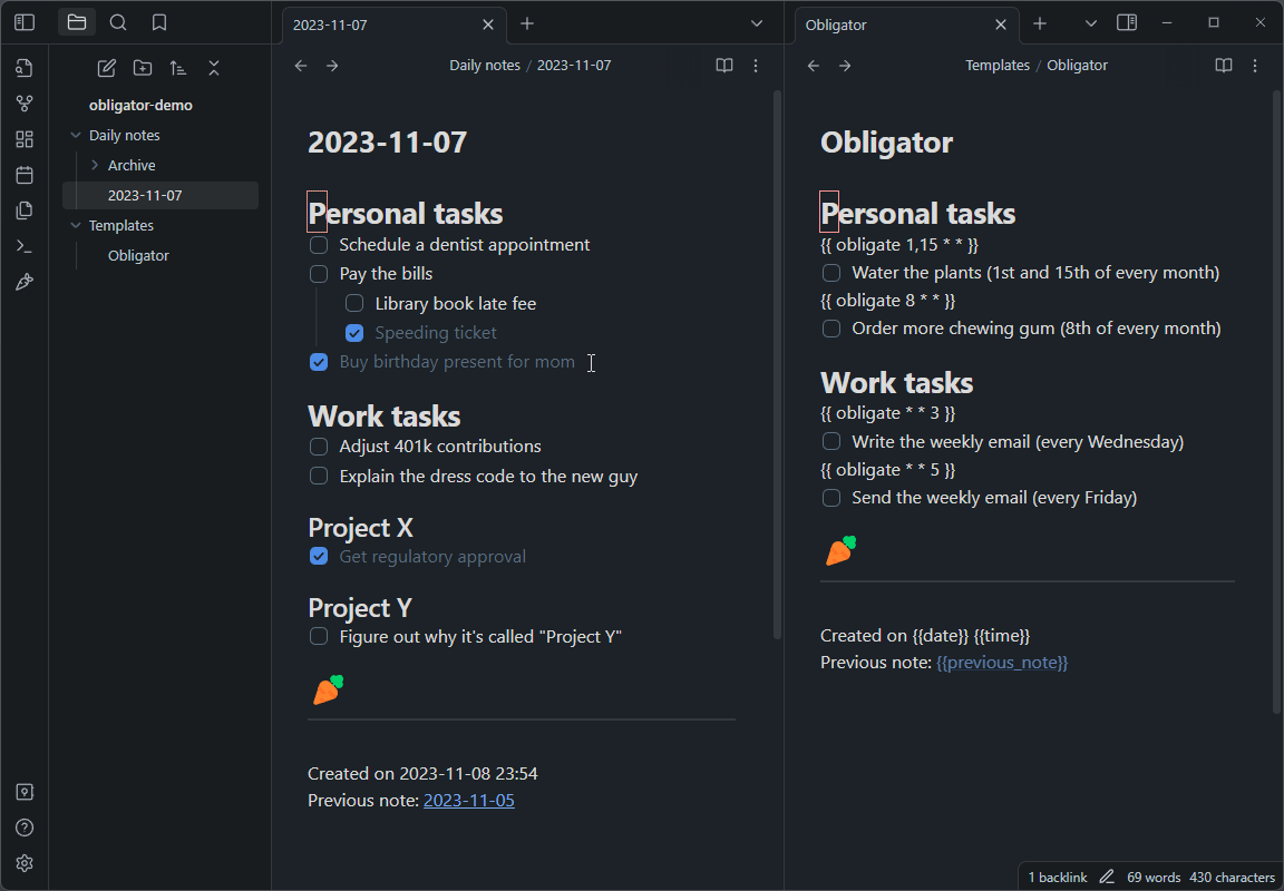A fully featured replacement for the built-in daily notes plugin. Obligator functions like a virtual bullet journal by copying over unchecked to-do items to your new daily note, along with adding any scheduled items you've set up.