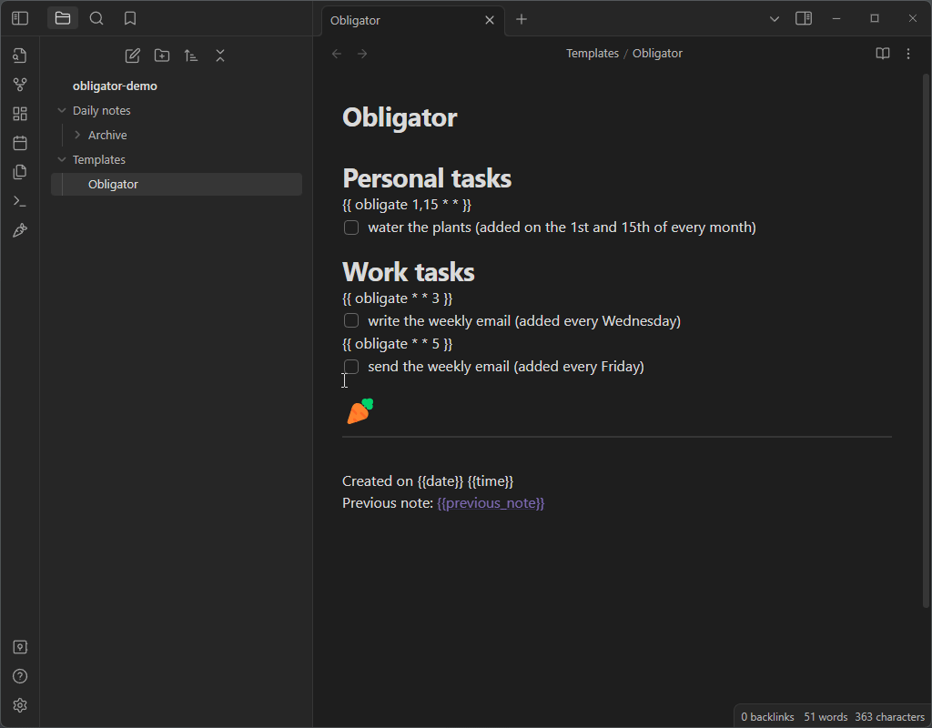 {{ obligate * * * }} is a very powerful macro. It lets you set up recurring to-do items in your template. It uses a simplified version of the cron syntax, where the asterisk represent day-of-the-month, month-of-the-year, and day-of-the-week in that order. See crontab.guru to play around with the syntax. The obligate macro will add the immediately proceeding line if you the date matches for any day between your last note and today. See the example template file for plenty of common examples. If you are confused about this and want some help, just open a GitHub issue.