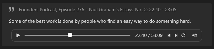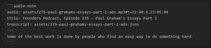 The workflow below follows the CODE process by Tiago Forte: Capture, Organize, Distill, and Express. You can quickly capture the information you care about and can come back to it later to organize, distill, and express it without losing your train of though on the podcast/audio you're listening to. This helps to avoid the Doorway effect.