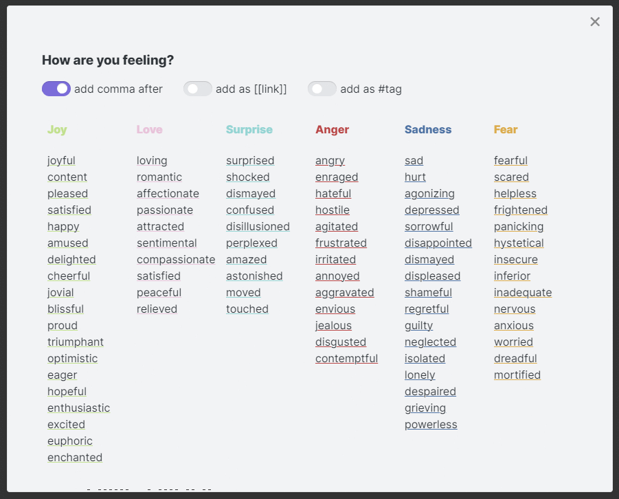 Paste an emotion / feeling into note, using customizable list of emotions (or sensible default one).