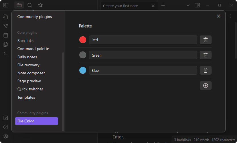 To add colors to the palette open the plugin settings, and click the + button. Then use the color picker to select the color, and input a name for the color. Afterwards it will appear in the Set color modal. You can add as many colors as you need.