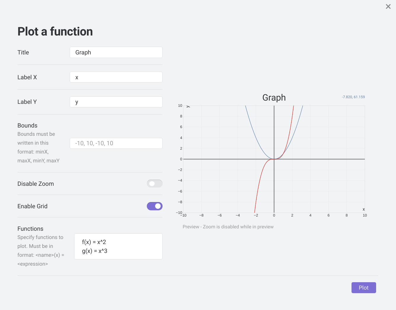 -10 < x < 10, -10 < y < 10and plot the functions f and g. If you havent disabled it, you can even drag and zoom the graph.