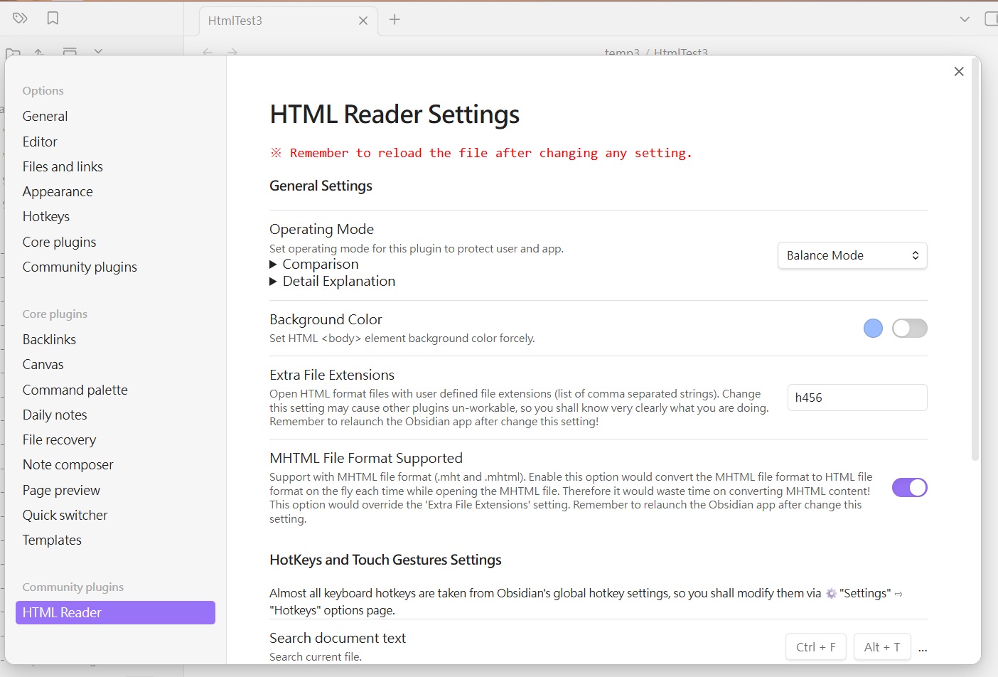 Open HTML format files with user defined file extensions (list of comma separated strings). Change this setting may cause other plugins un-workable, so you shall know very clearly what you are doing. Remember to relaunch the Obsidian app after change this setting!