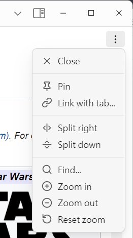 After a HTML file opened, the three dots ⋮ "more options" menu icon on right-upper corner of tab would be added some menu items.