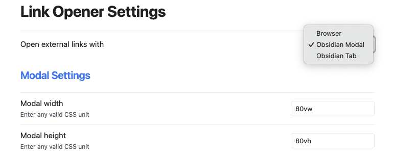 In settings, select which method you would like to open an external link with. You can also adjust the link opener modal's width and height.