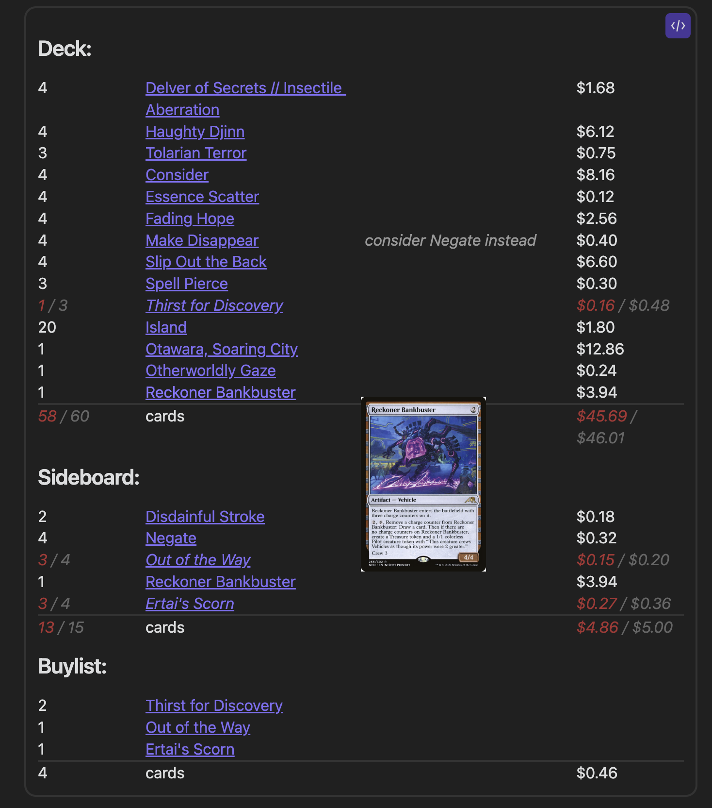 You can also copy paste directly from MTGA exports, though setlists and collector's numbers will not be shown and are not yet supported in the renderer.