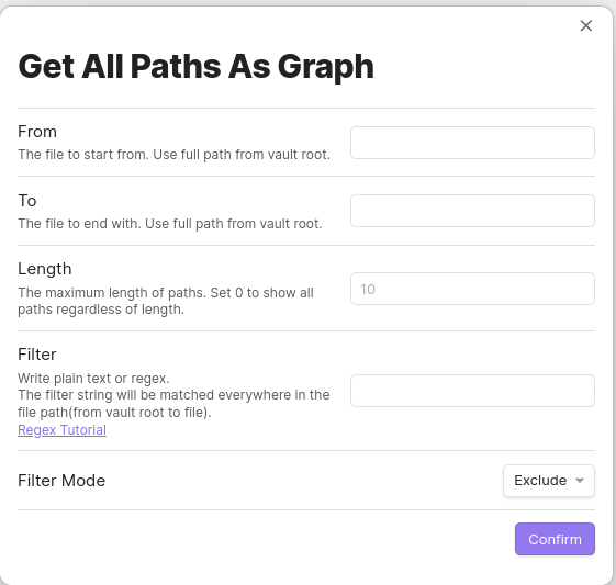 Length: The maximum length of all paths. Often a path that is too long can be meaningless, so length limitation may be necessary. Set 0 to show all paths regardless of length. Setting length to 0 may lead to Obsidian crushing due to mass amount of nodes rendering if your vault is too big, so use at your own risk.