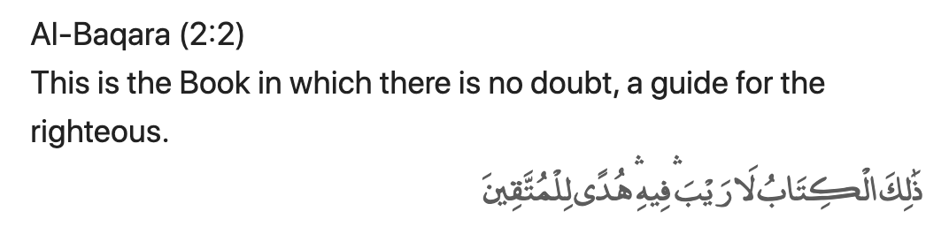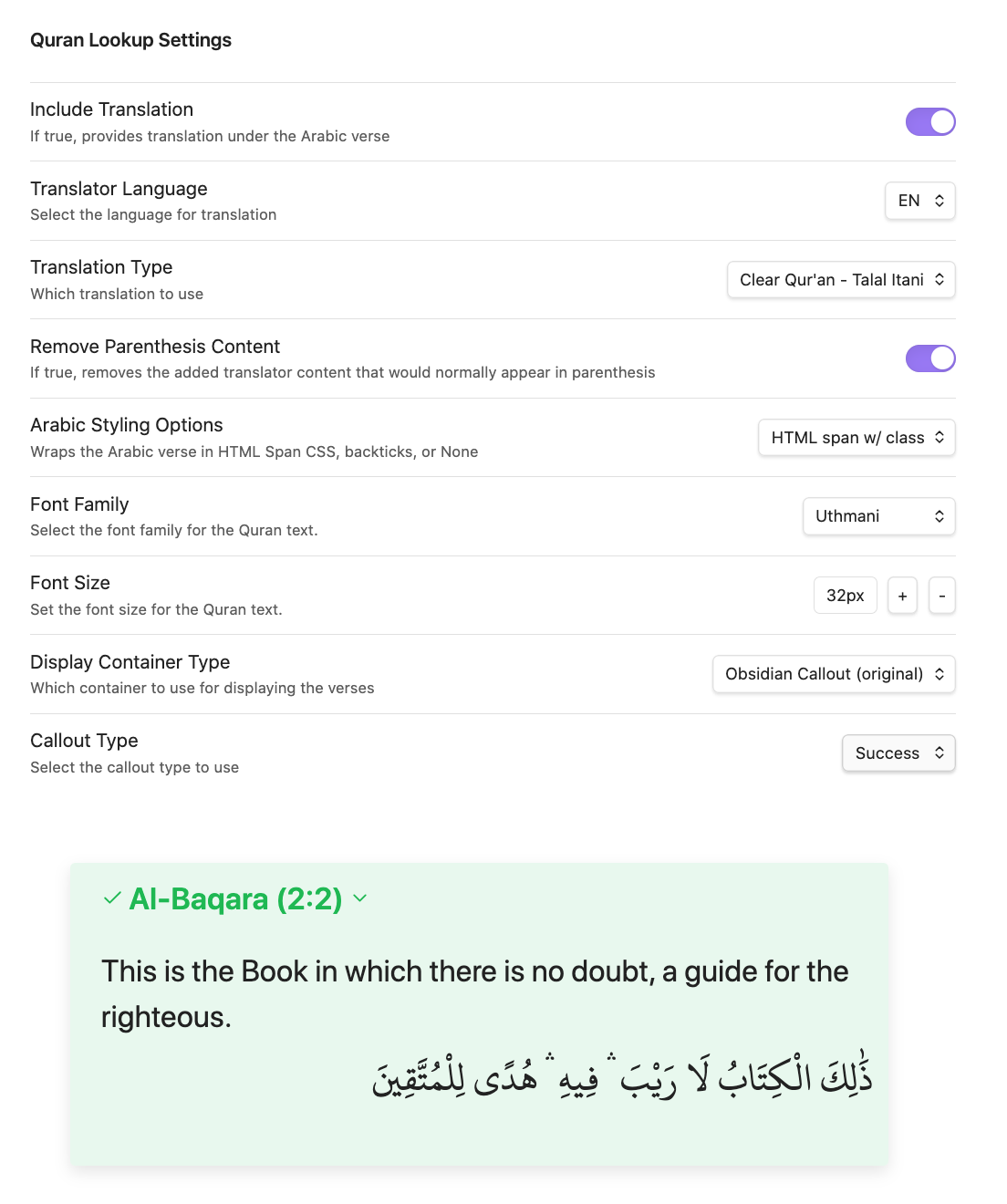 It looks up based on Surah-Number:Ayah-Number or Surah-Name:Ayah-Number syntax. For the Surah-Name lookup it uses Fuse.js to do a "fuzzy search" since it's an english transliteration. It replaces that syntax with an Obsidian call-out showing verse+ayah name, arabic, and english.